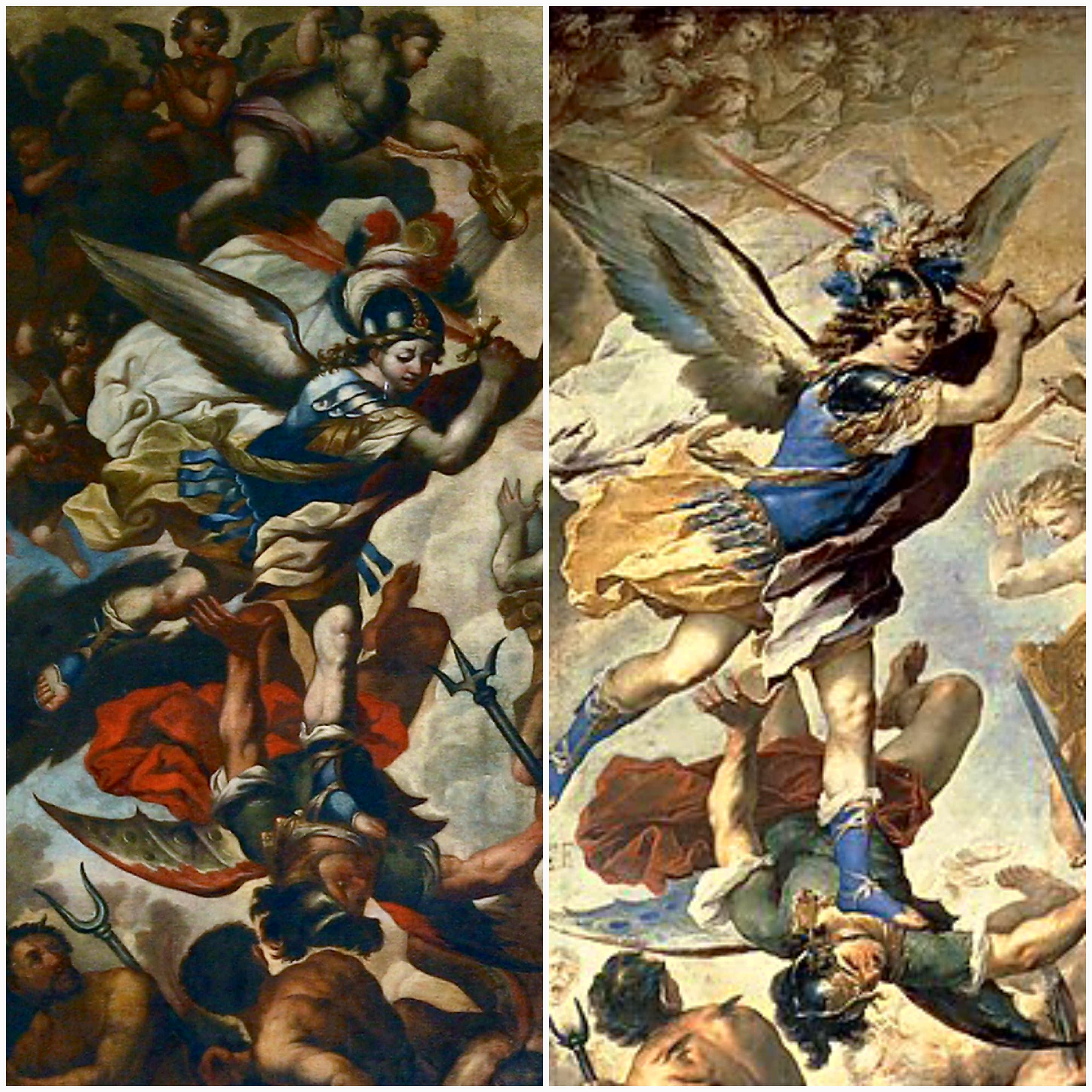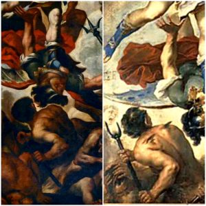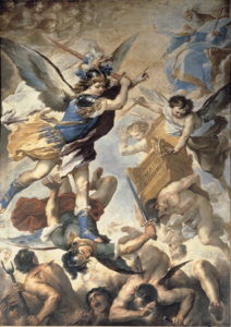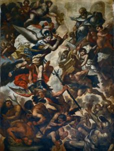 In tale dipinto qui preso in esame, assistiamo all’episodio dell’apocalisse in cui l’evangelista Giovanni dice le seguenti parole “Scoppiò quindi una guerra nel cielo: Michele e i suoi angeli combattevano contro, il drago. Il drago combatteva insieme con i suoi angeli, ma non prevalsero e non ci fu più posto per essi in cielo. Il grande drago, il serpente antico, colui che chiamiamo il diavolo e satana e che seduce tutta la terra, fu precipitato sulla terra e con lui furono precipitati anche i suoi angeli” (Apocalisse: 12,7-9).
