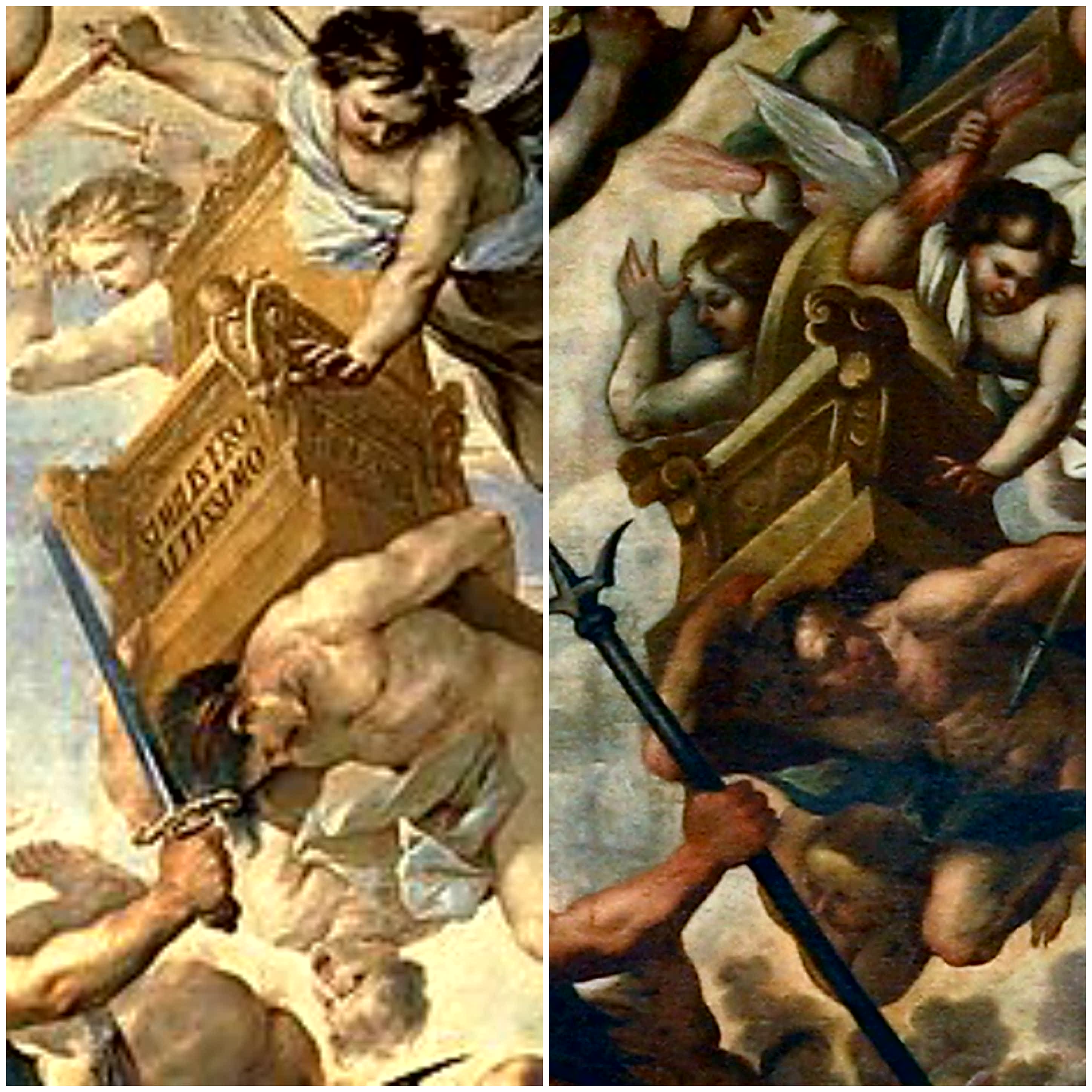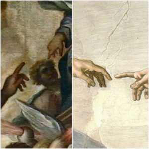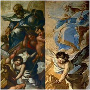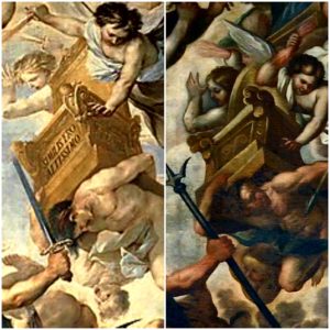 Lo scoppio della guerra di cui ci parla San Giovanni, è qui raffigurato dal gesto di Dio che indica l’arcangelo Michele come per ordinare ad esso di attaccare Lucifero e i suoi seguaci. A sua volta, l’arcangelo indica Dio e le loro mani che si indicano reciprocamente, richiamano alla mente le mani di Dio e di Adamo nell’affresco raffigurante la “Creazione di Adamo” eseguito da Michelangelo Buonarroti tra il 1508 e il 1512 nella volta della cappella Sistina, in Vaticano.