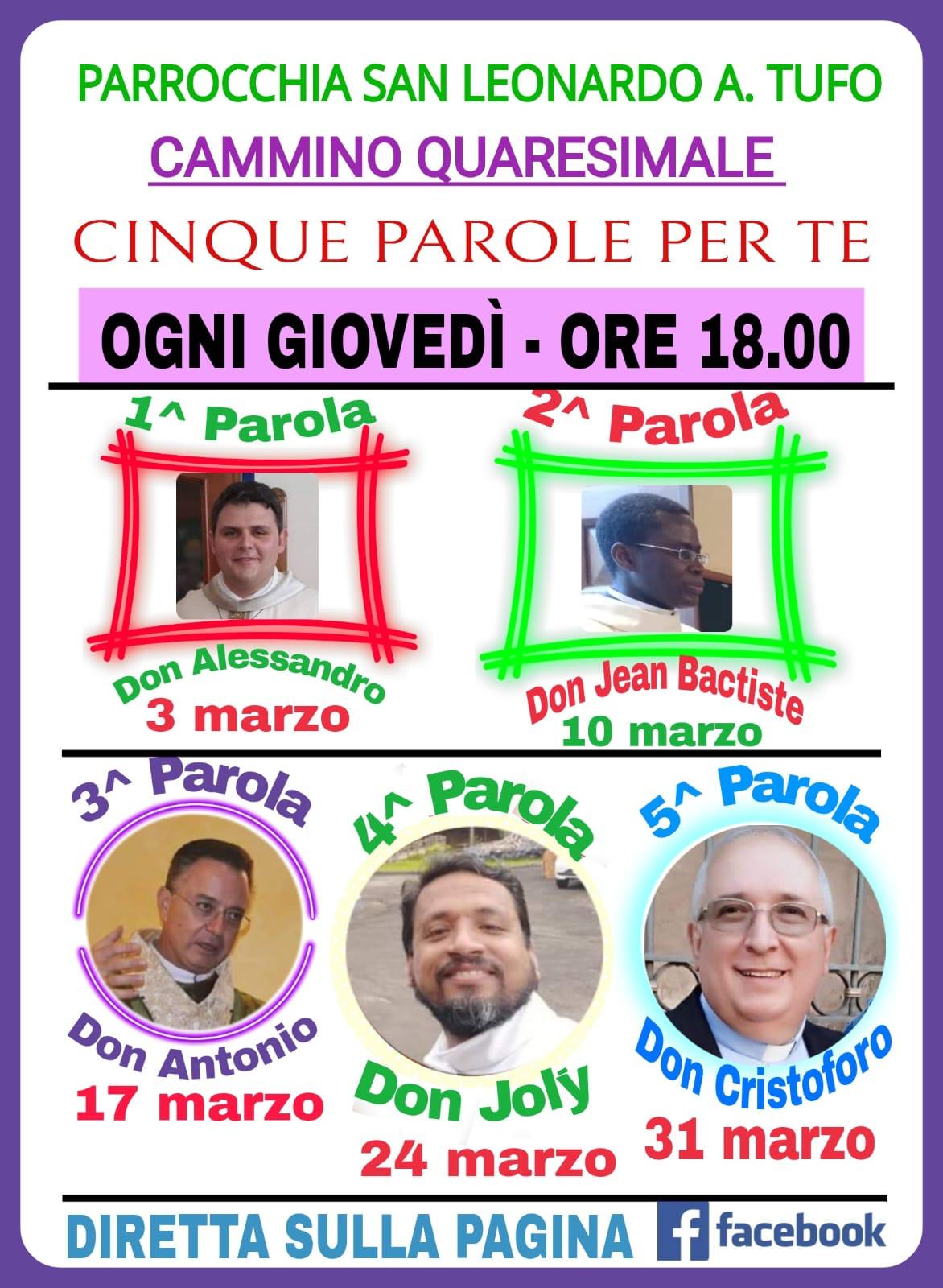 In ordine cronologico don Alessandro Corrente (3 marzo), Don Jean Bactiste (10 marzo), Don Antonio (17 marzo), Don Joly (24 marzo), Don Cristoforo (31 marzo). Una bella occasione di crescita per l’intera comunità parrocchiale tufara.