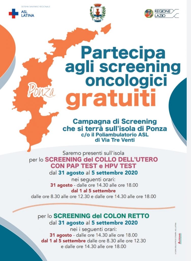 Screening oncologici gratuiti, dal 31 agosto al 5 settembre, a Ponza, presso il Poliambulatorio ASL in Via Tre Venti. Sarà possibile effettuare dal 31 agosto, dalle ore 14.30 alle ore 18, e dal 1 al 5 settembre, dalle ore 8 alle ore 12.30, e dalle 14.30 alle 18, uno screening del collo dell’utero con PAP Test e HPV Test oppure uno screening del colon retto gratuitamente.
