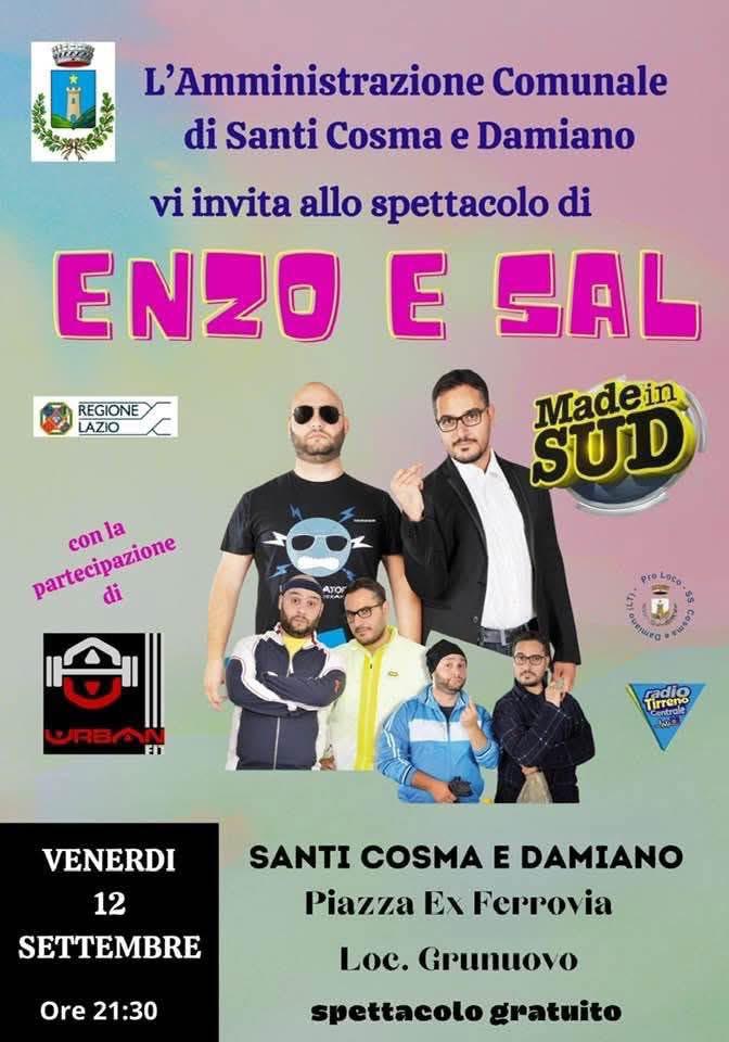 Santi Cosma e Damiano: la comicità non si ferma! Enzo e Sal in scena venerdì 12 settembre a Grunuovo – Santi Cosma e Damiano: la comicità non si ferma! Enzo e Sal in scena venerdì 12 settembre a Grunuovo – Dopo il successo della rassegna teatrale conclusasi il 6 settembre, la comicità continua a essere protagonista assoluta nel Comune di Santi Cosma e Damiano. L’appuntamento imperdibile è per venerdì 12 settembre alle ore 21:31 in Piazza Ex Ferrovia, località Grunuovo, dove saliranno sul palco due grandi nomi della risata: Enzo e Sal, direttamente dal fortunato format televisivo Made in Sud.