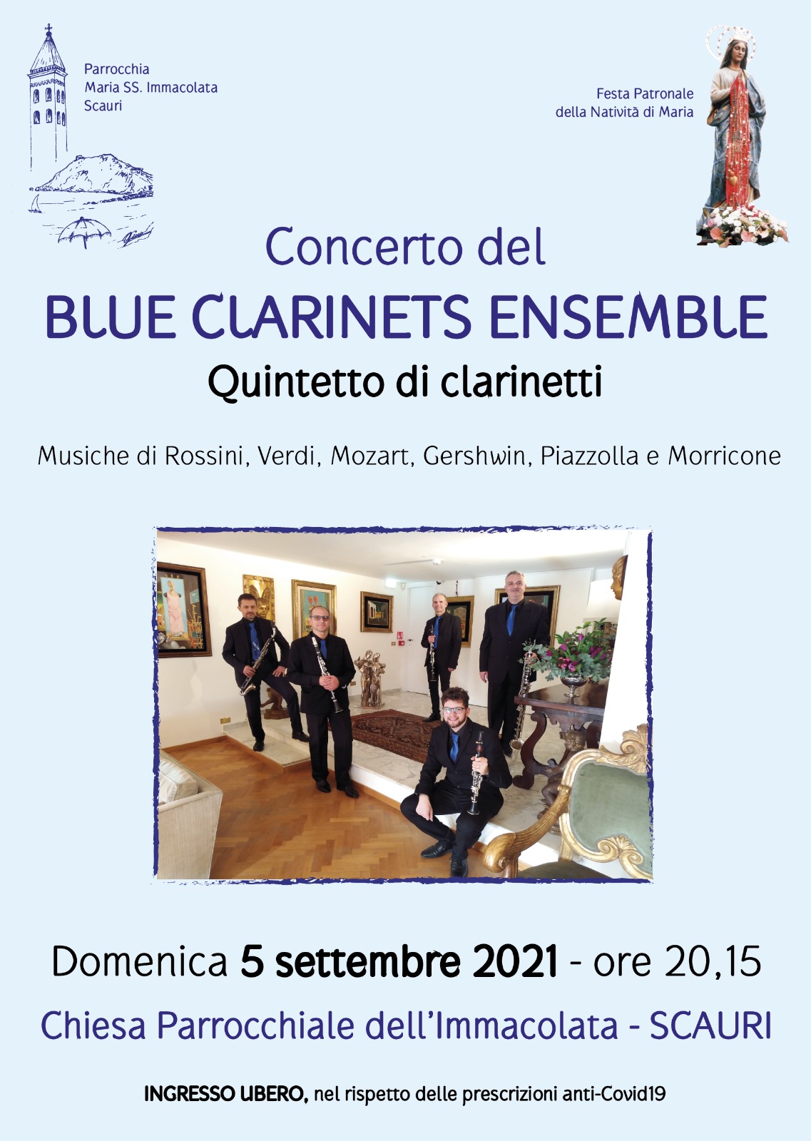 Nel contesto per i festeggiamenti in onore della Madonna che si festeggia l’8 settembre da “illo termpore” domenica 5 settembre alle 20.15 nella Chiesa dell’Immacolata in Scauri concerto prestigioso del Blue Clarinets Ensemble di cinque elementi.