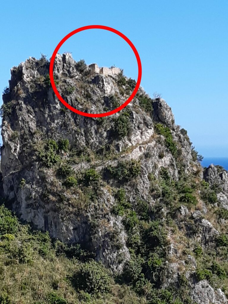 I gradini e i parapetti ancora visibili mostrano segni evidenti di restauri e rimaneggiamenti moderni. L’accesso alla scala si trova però a circa 2,5 metri dal piano di calpestio, dettaglio che fa ipotizzare la presenza originaria di una rampa mobile in legno, probabilmente rimovibile per impedire l’accesso agli invasori. La sommità del picco roccioso ospita una zona pianeggiante sulla quale sono presenti due ambienti: il primo, di forma rettangolare e allungata, affiancato a sud da un secondo vano più ampio, anch’esso rettangolare ma disposto ortogonalmente rispetto al primo. Al centro dell’insediamento si apre una piccola piazzetta incassata, protetta a nord da rupi più elevate che occultavano perfettamente le costruzioni alla vista dal basso. Le mura sono visibili sulla facciata del primo edificio e lungo il margine orientale del pianoro; nell’edificio affacciato sul lato della grotta si distingue chiaramente una porta, ancora oggi riconoscibile.