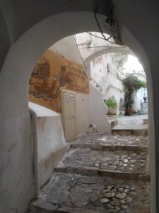 Come mai siamo attratti da borghi simili, perché desideriamo viverli, pur venendo da città piccole o grandi ma sicuramente più ricche di comodità e possibilità? E’ probabilmente un fatto di misura, un ritorno inconscio a distanze che ci sono in maniera ancestrale più familiari, a misura d’uomo. Alcune viuzze di Sperlonga non superano il metro e sono a stretta misura di essere umano; le strade delle nostre città sono fatte a misura di automobile, che è una protesi non umana del nostro vivere. Riprendiamo così il ricordo di un vivere antico, fatto di maggior semplicità e perciò più rassicurante. In qualsiasi parte del borgo si soggiorni bastano pochi passi per affacciarsi sul mare, per avere dinanzi a se la torre di guardia che in qualche occasione fu inutile baluardo di difesa.