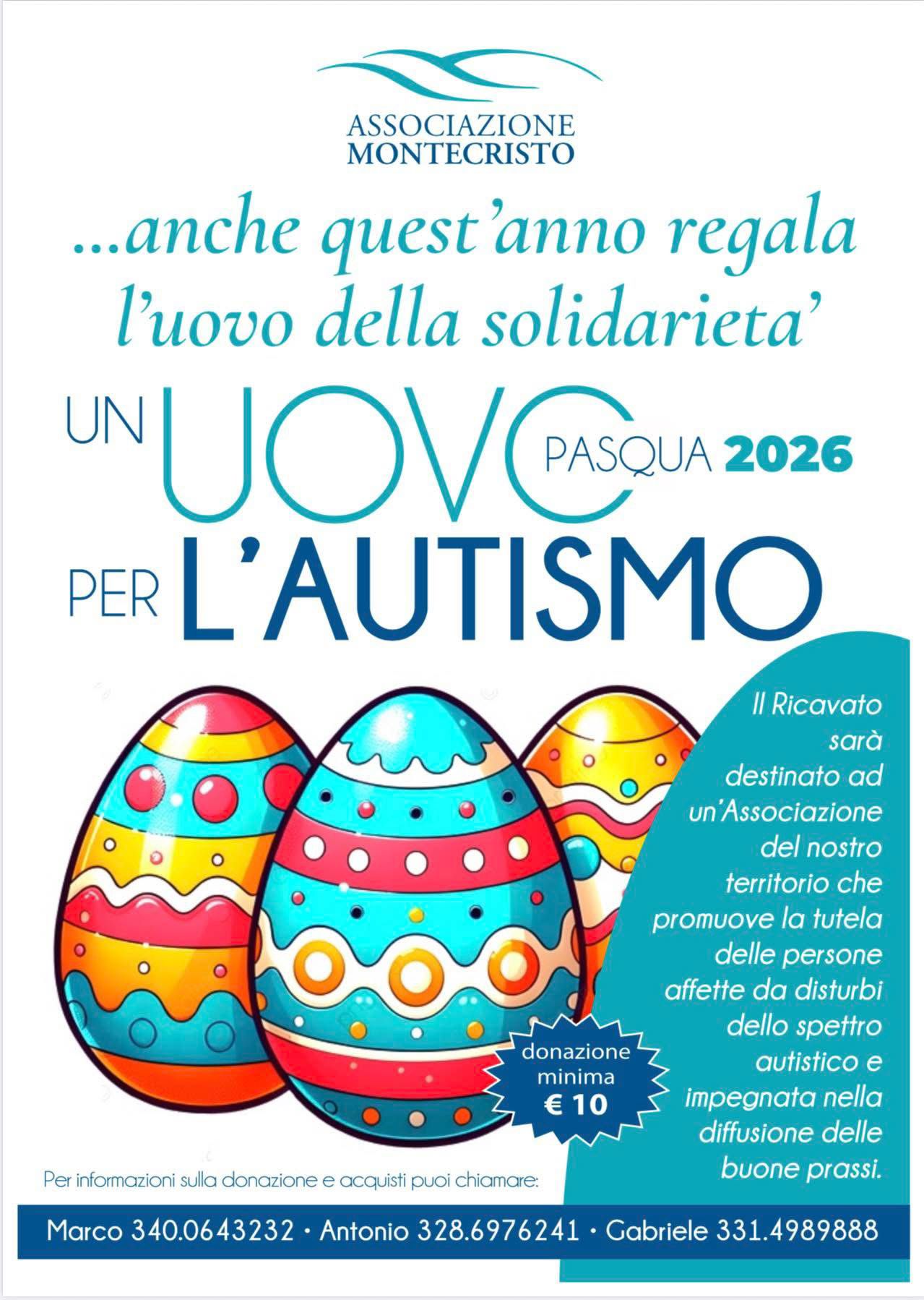 Torna “Un Uovo per l’Autismo”: al via la quarta edizione dell’iniziativa solidale – Un piccolo gesto che racchiude un grande significato. Con questo spirito prende il via la quarta edizione di “Un Uovo per l’Autismo”, l’iniziativa promossa dall’Associazione Culturale MonteCristo, che torna a mobilitare il territorio nel segno dell’inclusione e della solidarietà.