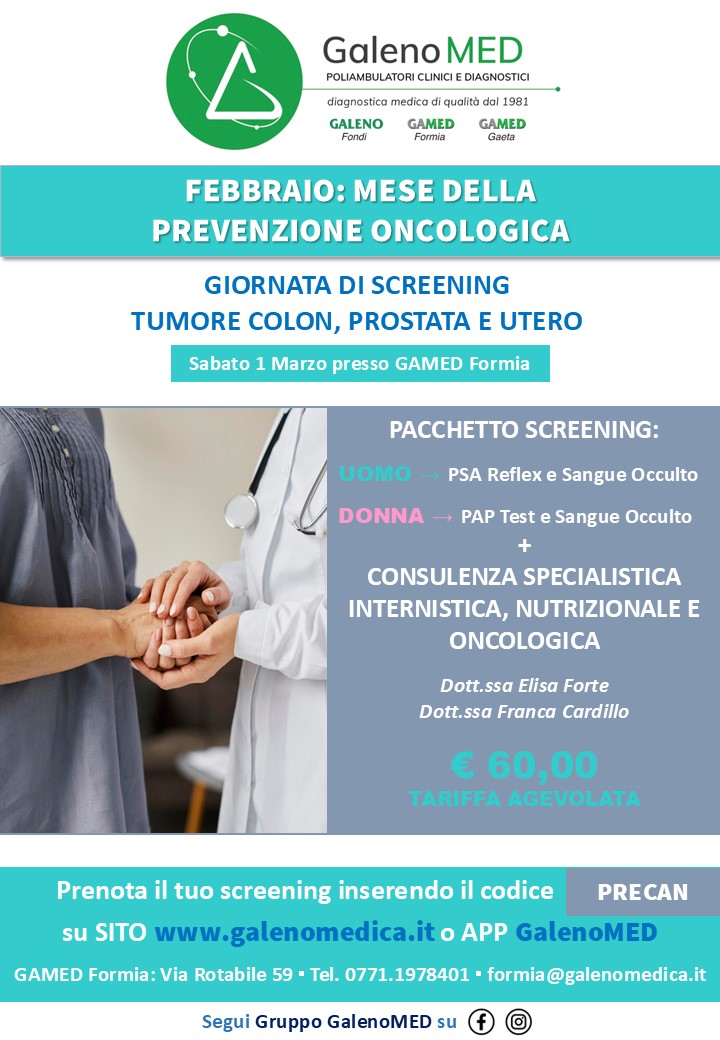 Galeno MED – Sabato primo marzo presso il Gamed di Formia, a conclusione del mese di febbraio dedicato alla prevenzione oncologica e che ha visto attivarsi per gli screening anche le altre strutture Galeno Medica di Fondi e Gaeta, la giornata sarà dedicata allo screening tumore colon, prostata e utero. Ad una tariffa agevolata di 60,00 euro, si potrà usufruire di un pacchetto uomo o donna che prevede: Uomo, PSA Reflex e sangue occulto con consulenza specialistica; per la Donna, Pap Test e sangue occulto con consulenza specialistica. Le consulenze specialistiche sono in ambito nutrizionale, internistico e oncologico. A cura delle dottoresse Elisa Forte e Franca Cardillo. Sul sito www.galenomedica.it si può prenotare screening con il codice PRECAN. Si può prenotare anche sull’APP GalenoMED. Si ricorda che la sede Gamed di Formia si trova in via Rotabile,59 o al numero 0771.1978401, all’indirizzo di posta elettronica: formia@galenomedica.it
