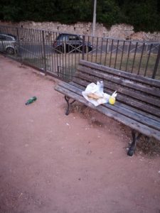 E mentre la mattinata scorre serena, giungiamo così all’ora di pranzo, e cosa c’è di meglio di una mangiata in compagnia in pineta? Saranno i troppi zuccheri dati da frittata di pasta, peperonata, salumi, coccobello-coccofresco e anguria per gradire, a far scambiare, a pranzo finito, l’albero per il cestino dei rifiuti. Per carità che fatica camminare sotto il sole per gettare i rifiuti. Che sarà mai una bottiglia di vetro in più, tra le tante sparse qua e là? E poi non dicevano che il vetro lo fanno dalla sabbia? E poi mal che vada lo raccoglierà qualcun altro perché io!