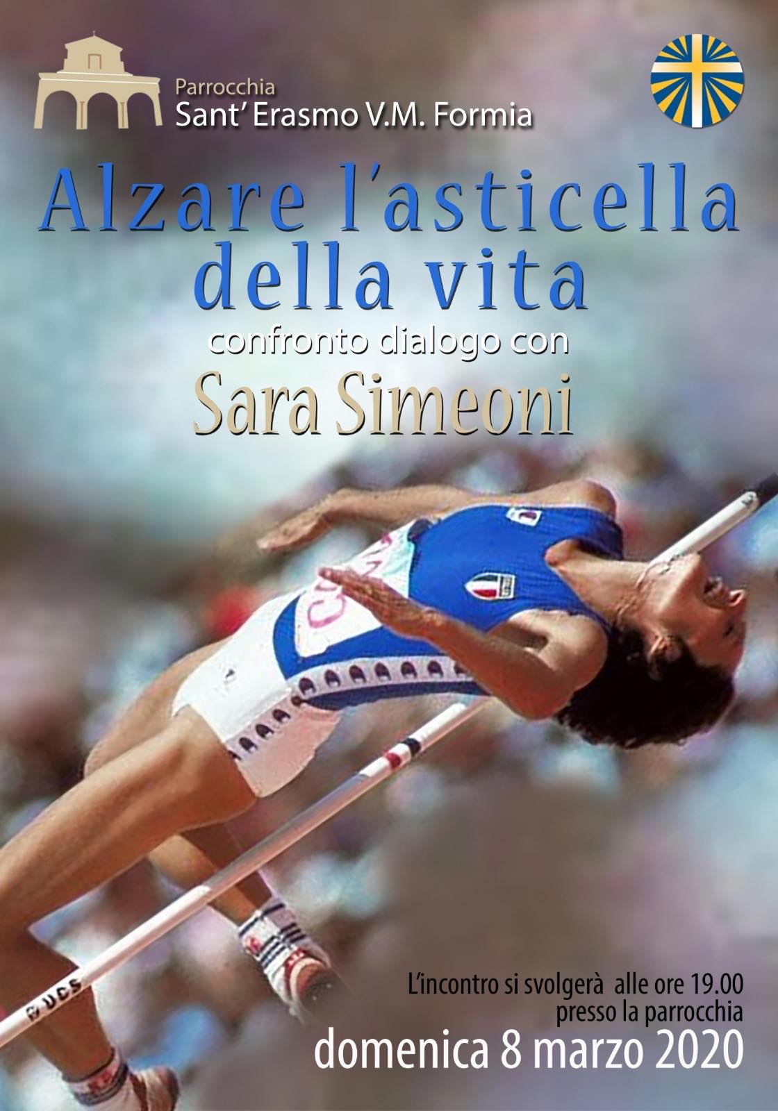 Dialogo e confronto con la campionessa olimpionica Sara Simeoni. Domenica 8 marzo alle ore 19.00 presso la Chiesa parrocchiale di Sant’Erasmo in Formia interviene: la campionessa olimpionica e non solo, Sara Simeoni. Modera la giornalista Dott.ssa Piera Mastantuono. Evento organizzato dall’ Azione Cattolica della parrocchia di Sant’ Erasmo. L’incontro tende a celebrare il genio femminile a servizio della comunità e dello sport. Sara Simeone è nata a Rivoli Veronese nel 1953. Nel 1976 fu medaglia d’argento a Montreal, nel 1978 record mondiale a 2,01, nel 1980 medaglia d’oro a Mosca e nel 1984 ancora argento a Los Angeles.