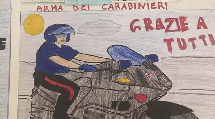 Durante la visita gli alunni hanno voluto ringraziare i Carabinieri omaggiandoli con dei disegni e due