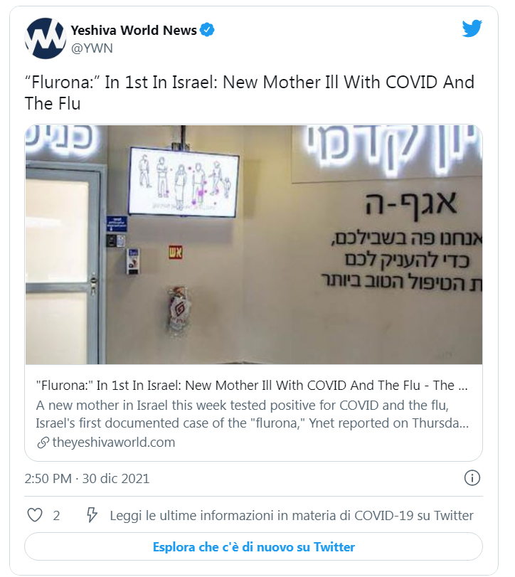 Flurona, primo caso ad Israele. Contagio da Covid e influenza. A riportare questa notizia è “Yeshiva Word News” dove si evince che una giovane donna è stata contagiata da Flurona ovvero dal covid-19 e influenza insieme. L’etimologia della parola Flurona non è nient’altro che la combinazione di influenza e coronavirus. La donna è stata dimessa dall’ospedale dove era stata ricoverata e ora sta bene.