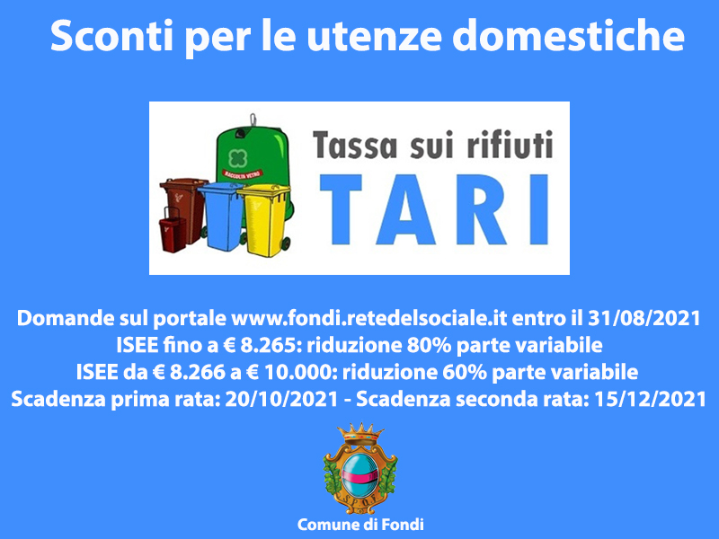 FONDI – Dopo l’approvazione del quinto punto all’ordine del giorno nell’ultimo Consiglio comunale, che ha visto l’assemblea votare le nuove agevolazioni Tari destinate alle utenze domestiche, con la determina 767 del 3 agosto 2021 sono stati fissati i parametri per accedere agli sgravi.
