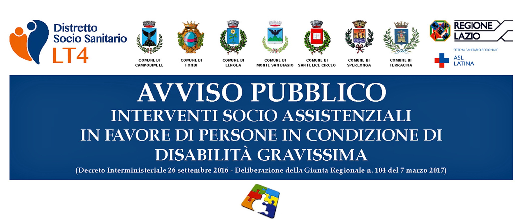 Il Vice Sindaco di Fondi Beniamino Maschietto e l’Assessore ai Servizi sociali Dante Mastromanno rendono noto che “è stato pubblicato dal Distretto Socio Sanitario LT4 (Campodimele, Fondi, Lenola, Monte San Biagio, San Felice Circeo, Sperlonga e Terracina) l’avviso pubblico relativo a interventi socio assistenziali in favore di persone in condizione di disabilità gravissima. I suddetti interventi sono realizzati dal Distretto grazie a una quota delle risorse della Misura 3 “Non Autosufficienza” del Piano Sociale di Zona, assegnate dalla Regione Lazio. I destinatari degli interventi socio assistenziali previsti sono le persone residenti nei Comuni del Distretto Socio Sanitario LT4 in condizione di disabilità gravissima, ivi comprese quelle affette da Sclerosi Laterale Amiotrofica (SLA) e quelle con stato di demenza molto grave, tra cui quelle affette dal morbo di Alzheimer in tale condizione, come definite dall’articolo 3, comma 2, del Decreto Interministeriale 26 Settembre 2016. Per persone in condizione di disabilità gravissima, ai soli fini del decreto, si intendono le persone beneficiarie dell’indennità di accompagnamento, di cui alla Legge 18 dell’11 Febbraio 1980, o comunque definite non autosufficienti ai sensi dell’allegato 3 del Decreto del Presidente del Consiglio dei Ministri n. 159 del 5 Dicembre 2013, e per le quali sia verificata almeno una delle condizioni previste dall’articolo 3, comma 2, del decreto”.
