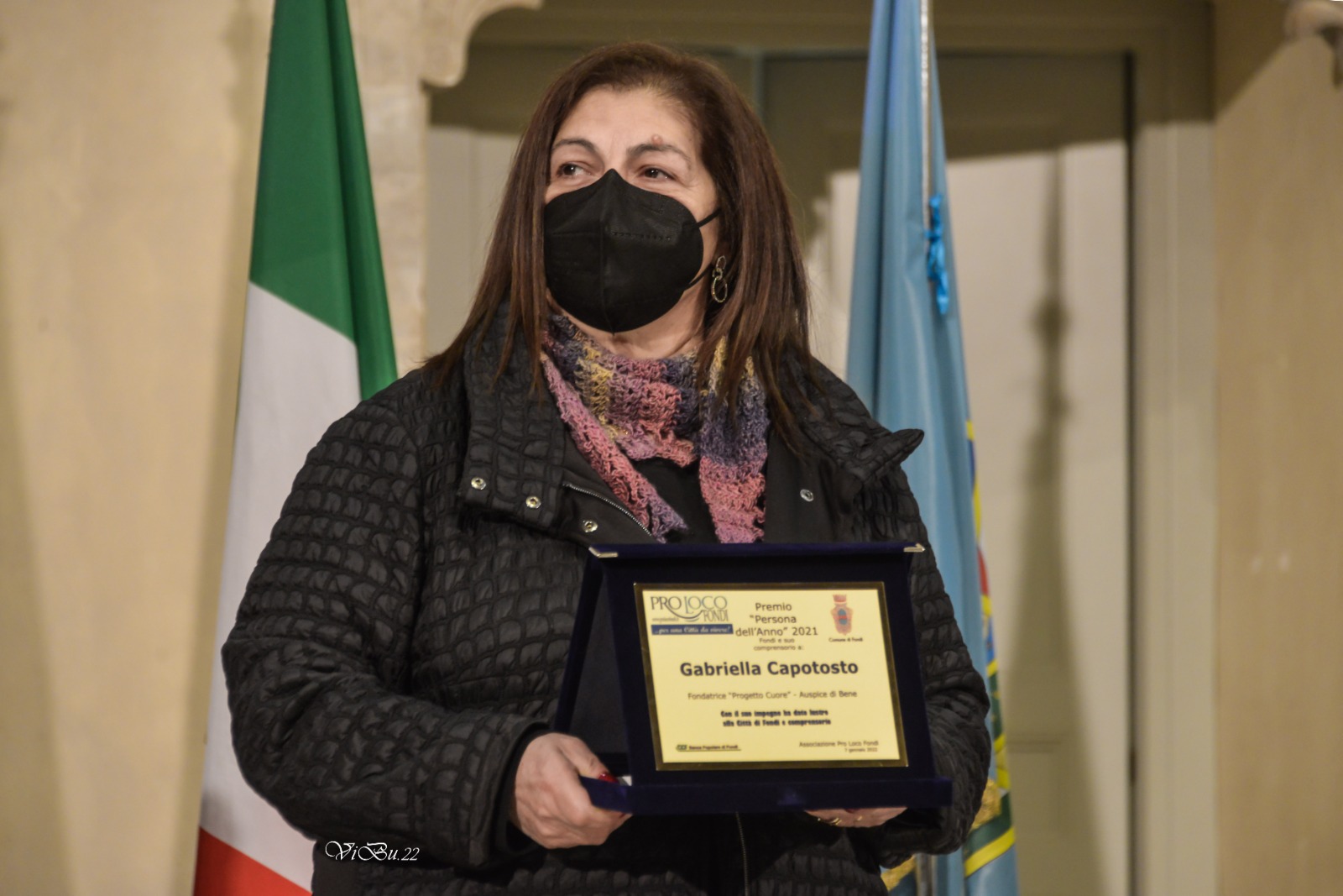 Fondi: Gabriella Capotosto è la persona dell’Anno 2021 – Il nome più indicato dai cittadini è una donna e la Persona dell’Anno 2021 è Gabriella Capotosto del “Progetto Cuore”. La proclamazione è avvenuta al termine di una piacevole serata nel Palazzo Caetani di Fondi venerdì 7 gennaio. A premiare la vincitrice è stato il sindaco di Fondi Beniamino Maschietto, il vicesindaco Vincenzo Carnevale, Gino Fiore Persona dell’Anno 2016 e il presidente della Pro Loco Fondi Gaetano Orticelli che ha condotto anche la serata.
