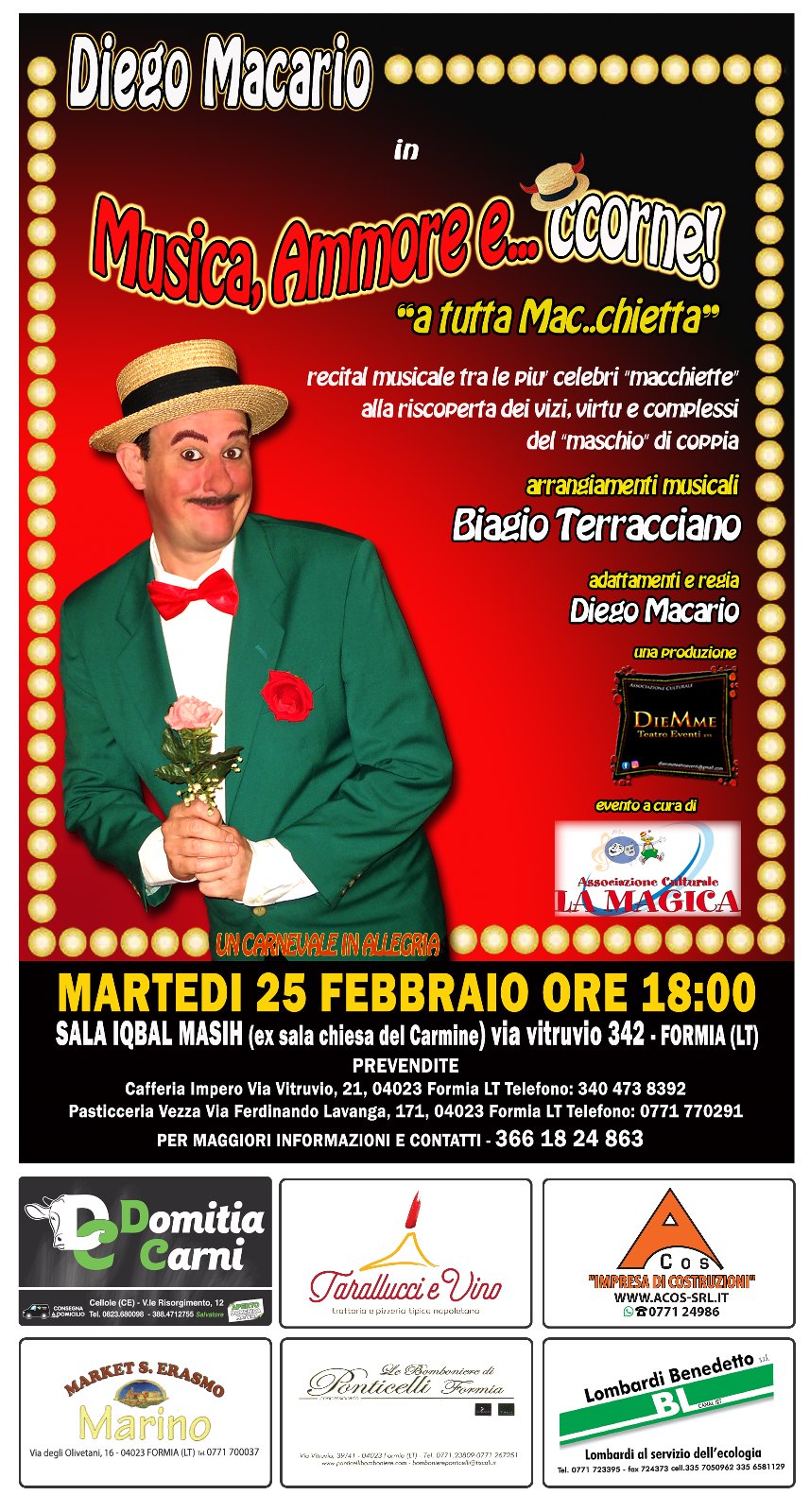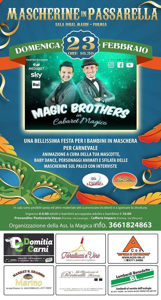 Due appuntamenti di grande interesse presso la sala Iqbal Masiq a Formia. Domenica 23 febbraio alle 10.30 MASCHERINE IN PASSERELLA ospiti d’onore con il loro bellissimo spettacolo e reduci da sky, radio uno e mediaset i MAGIC BROTHERS, in cabaret magico.. una festa per i bambini con mascotte e musica, ospite ROCCO PALAZZO ingresso € 5.00 . Martedi 25 febbraio Alle 18.00 invece MUSICA AMMORE E CCORNE! A tutta macchietta con Diego Macario per una serata tutta da ridere con uno spettacolo che ricalca la macchietta napoletana e che già ha avuto tanto successo nei teatri campani. Ingresso € 10.00 i biglietti sono acquistabili presso la pasticceria vezza in via lavanga formia e la cafferia impero in via vitruvio formia. Info 3661824863 organizzazione associazione la magica.