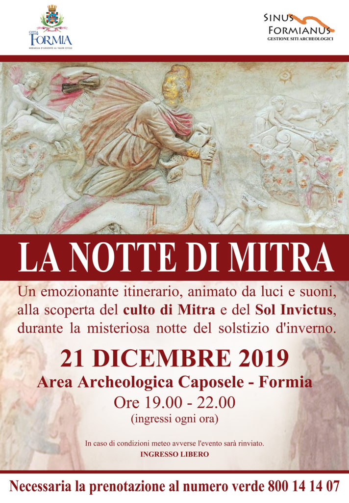Nell’ambito della manifestazione Saturnalia, patrocinata dal Comune di Formia, in occasione del Solstizio d’Inverno, Sabato 21 dicembre l’Area Archeologica Caposele, a Vindicio, apre le porte al pubblico per una nuova e suggestiva proposta culturale: La Notte di Mitra.