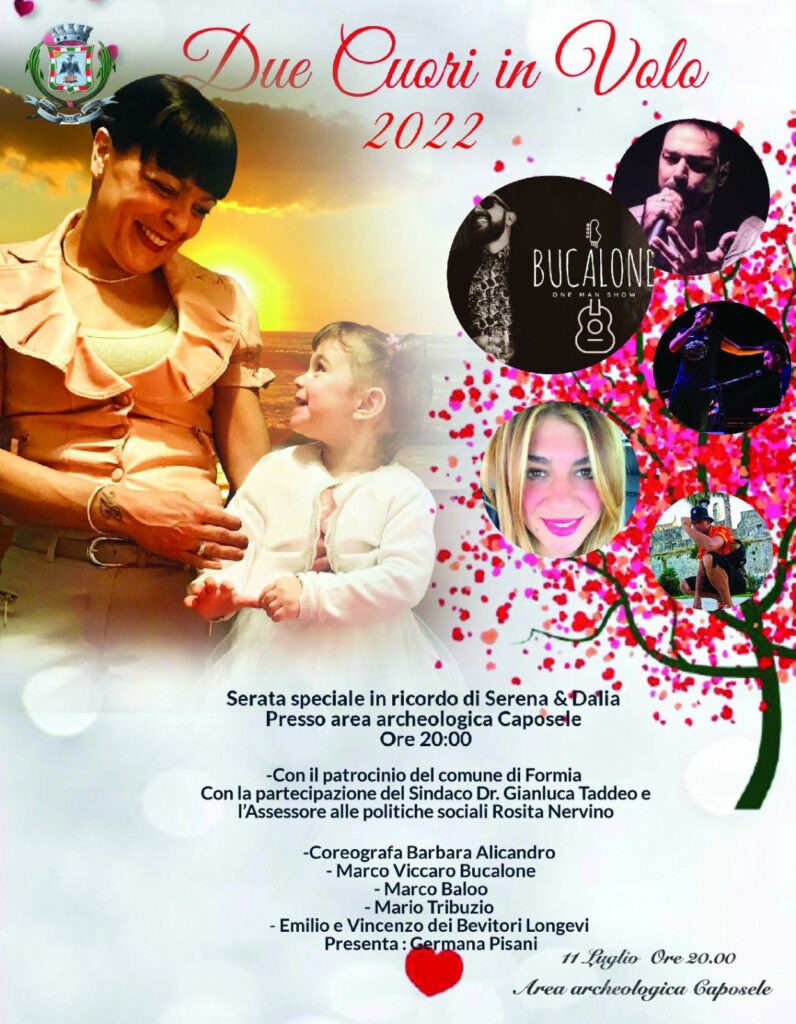 Formia, Memorial per ricordare Serena Pezzella e la piccola Dalia – La serata – moderata da Germana Pisani, una cara amica di Serena – avrà come ospiti artisti e performer che regaleranno ai presenti momenti emozionanti ed indelebili. Tra gli artisti musicali: Bucalone (Marco Viccaro, chitarrista e cantautore), Marco Baloo (rapper e autore), Mario Tribuzio (cantautore) ed Emilio e Vincenzo (componenti del gruppo musicale locale I Bevitori Longevi).