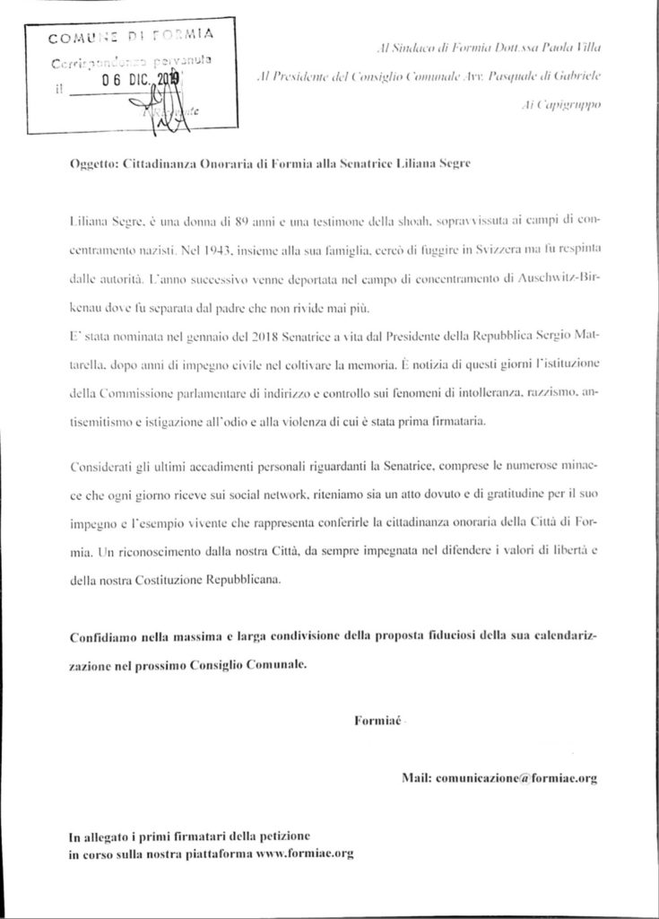 Venerdì 6 Dicembre 2019, una delegazione di Formiaé ha protocollato presso la casa comunale la proposta per il conferimento della cittadinanza onoraria di Formia alla Senatrice Liliana Segre.