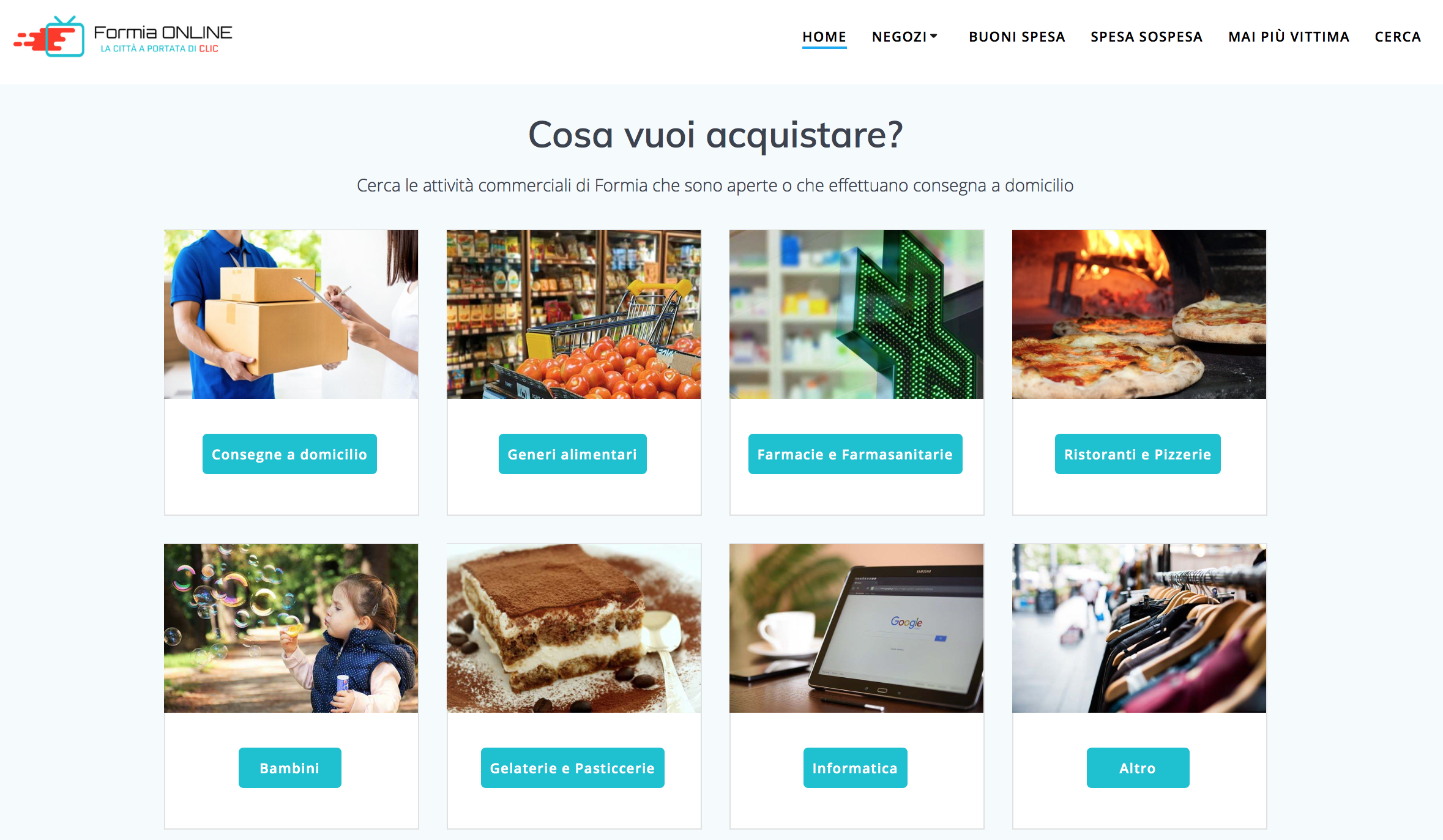 Formiaonline.it permette di contattare le attività commerciali di Formia che hanno aderito al progetto mettendo a disposizione i propri contatti per la richiesta delle merci a domicilio. Inoltre tramite il portale è possibile accedere alla consegna delle mascherine da parte del Comune di Formia, scoprire come donare la spesa sospesa oppure beneficiarne e come richiedere i buoni spesa e i bonus affitti. Sul sito è presente un articolo sull’associazione “Mai più vittima” che supporta attualmente diversi casi di violenza domestica verso donne e minori.