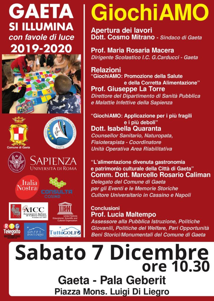 Nell’ambito delle iniziative di “Favole di Luce” le luminarie di Gaeta, sono in programma diversi appuntamenti culturali che si terranno presso il “PalaGeberit” la tensostruttura realizzata ad hoc nei pressi dell’Istituto “Virgilio” in piazza Mons. Di Liegro.