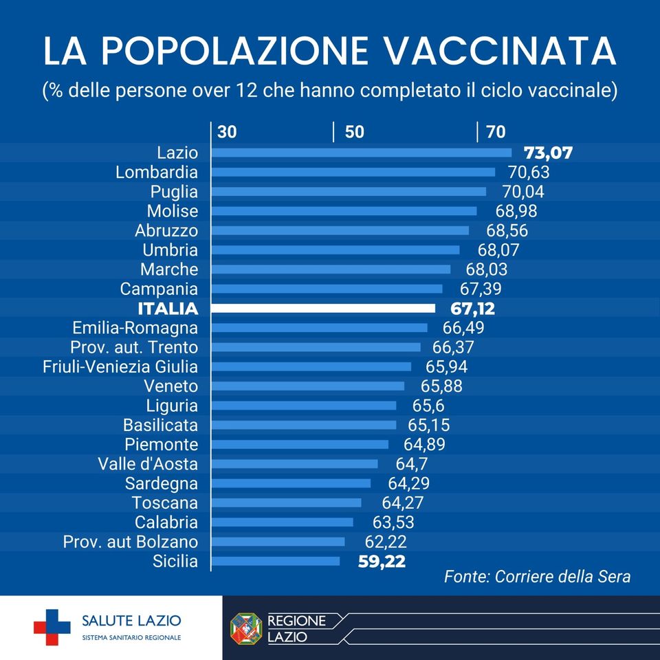 Over 12, Regione Lazio – #Coronavirus: la Regione Lazio è la regione italiana con la più alta copertura vaccinale. Oltre il 73% della popolazione over 12 ha completato il ciclo vaccinale rispetto ad una media nazionale del 67%.