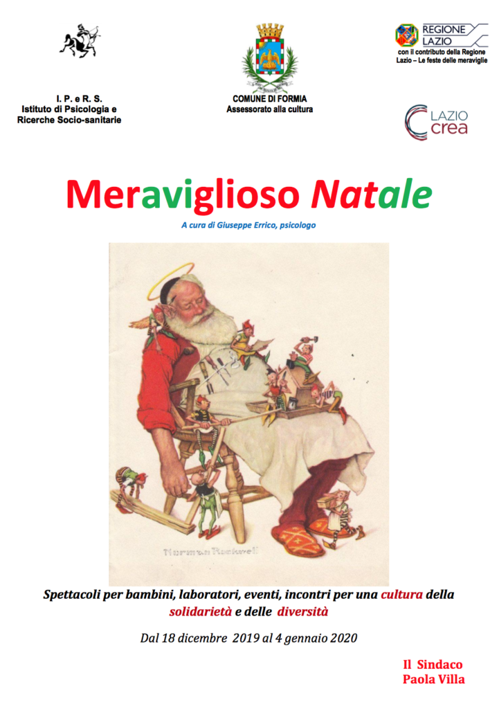 Dal 18 dicembre al 4 gennaio 2020 il Comune di Formia (assessorato alla cultura/servizi sociali), in collaborazione con l’Istituto di psicologia e ricerche socio sanitarie (I.P.eR.S.), hanno organizzato, nell’ambito del progetto Meraviglioso Natale (co-finanziato dalla Regione Lazio -Avviso Lazio Crea) un ciclo di eventi, spettacoli, laboratori ed incontri sul tema del natale, del gioco e della fiaba per promuovere la solidarietà.