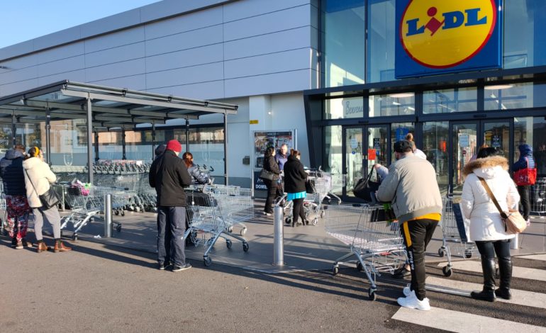 Persone che si accalcano dinanzi al bancone della gastronomia, commessi che portano la mascherina abbassata per respirare meglio, clienti che entrano senza alcuna protezione personale, e una tensione che si taglierebbe con il coltello. Nelle città le file ai supermarket durano ore, il personale assiste i clienti fornendo a tutti coloro che sono in attesa una bottiglietta di acqua minerale, disinfettante per le mani e guanti usa e getta Che Dio c’è la mandi buona.