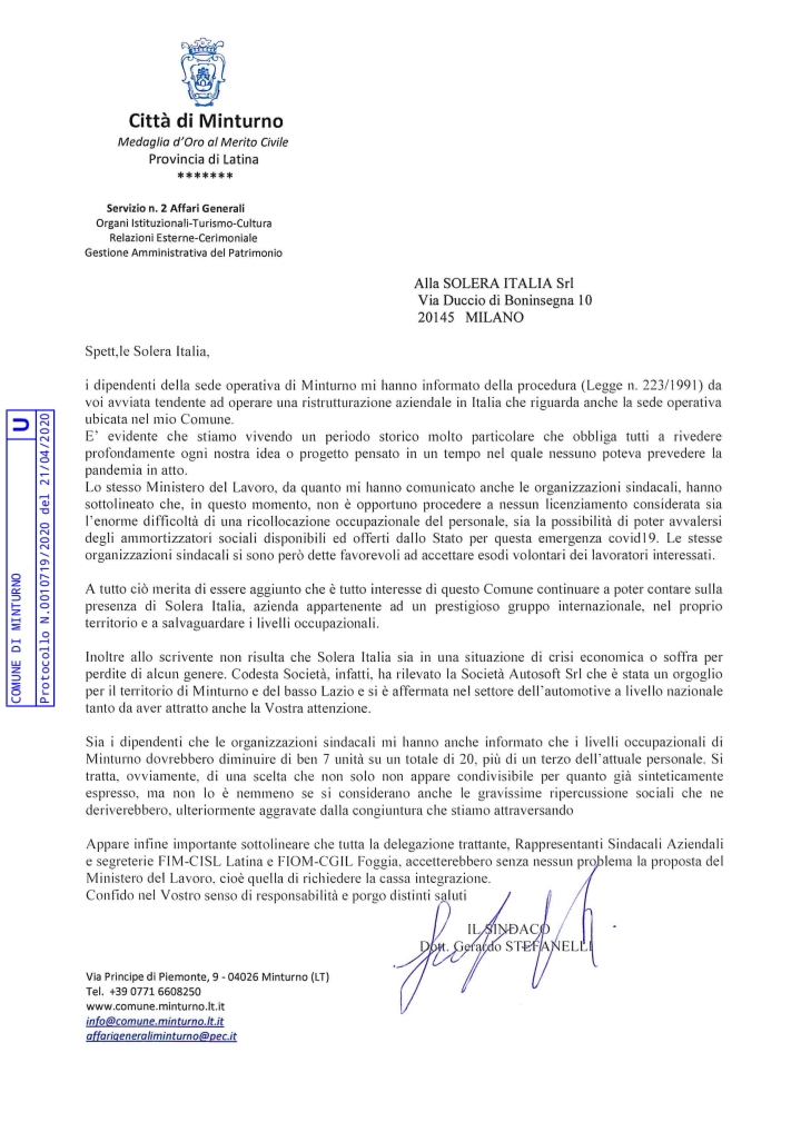 Dopo la comunicazione della società Solera, una tra le maggiori società specializzate nell’evoluzione digitale del settore assicurativo, di voler avviare la procedura di licenziamento di circa trenta unità in Italia, tra cui sette dipendenti della sede di Minturno, le organizzazioni sindacali si sono attivate nei giorni scorsi attraverso incontri presso il Ministero del Lavoro, il quale ha ipotizzato il ricorso agli ammortizzatori sociali, e per giovedì è previsto un altro incontro tra sindacati, azienda e Rsa. Sulla vertenza in atto è intervenuto il sindaco, Gerardo Stefanelli, del Comune di Minturno dove si trova una delle sedi della società milanese, il quale ha inviato una lettera rivolgendo un appello alla responsabilità della società, di fatto, precedentemente la crisi emergenziale Covid-19, non risultava essere in una situazione di crisi o di perdita economica. Sotto la lettera del sindaco del Comune di Minturno. Seguirà a breve l’approfondimento del giornalista Marcello Rosario Caliman