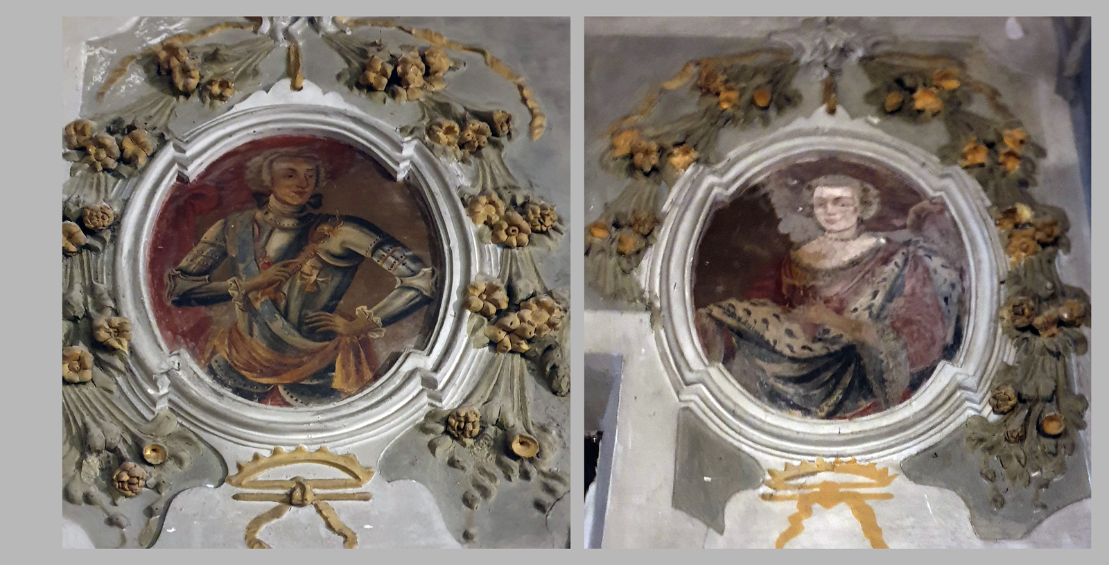 Grazie all’analisi puntuale delle decorazioni cavalleresche presenti nei due ritratti maschili sono riuscito ad arrivare ad una giusta attribuzione. Gli elementi distintivi erano l’armatura (con la quale sovente Carlo si faceva ritrarre), l’Ordine del Toson d’Oro, meglio distinguibile a Maranola, di cui comunque entrambi i personaggi citati si potevano fregiare. In ultimo una placca di un Ordine con una croce contenente una colomba rivolta verso il basso e la relativa fascia celeste fina ad oggi non tenuti in considerazione.