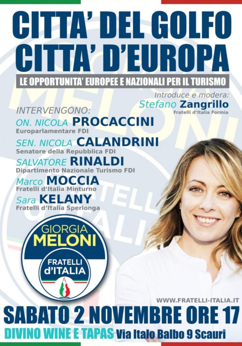 Si è svolto il 2 novembre 2019, nella enoteca “DiVino-Wine&tapas”, in Via Italo balbo, a Scauri, alle ore 17, l’incontro “Città del Golfo, città d’Europa, le opportunità europee e nazionali per il turismo” organizzato e promosso dal rappresentante locale del partito nazionale Fratelli d’Italia, Marco Moccia della sezione di Minturno, e al quale si sono uniti i rappresentanti Stefano Zangrillo di FdI Formia e l’avv. Sara Kelany di FdI Sperlonga. Ad intervenire sul tema del turismo, il parlamentare europeo, Nicola Procaccini, il senatore Nicola Calandrini e il responsabile romano del dipartimento turismo di Fratelli d’Italia, Salvatore Rinaldi.