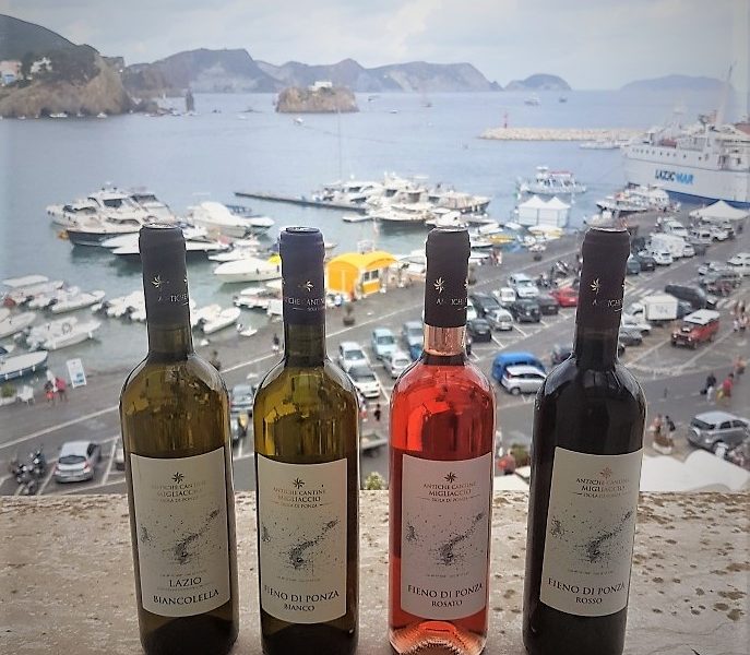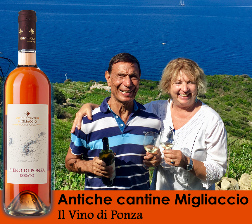 Tra i tanti vini I.G.P, quello di Ponza, che grazie alle condizioni pedoclimatiche dell’isola, è stato definito “unico”. La storia dell’azienda agricola “Antiche Cantine Migliaccio” di Ponza nasce nel 2000, grazie ad Emanuele Vittorio e sua moglie Luciana Sabino, che hanno deciso di riprendere a coltivare l’antico vigneto dell’omonimo antenato di Emanuele Vittorio. Infatti la storia del vigneto risale al 1734, anno in cui Carlo di Borbone colonizzò l’isola assegnando in “enfiteusi perpetua” vari appezzamenti di terra ai coloni partenopei, assegnando a Pietro Migliaccio, proveniente da Ischia, la zona del Fieno. Pietro Migliaccio portò da Ischia i vitigni tipici: Biancolella, Forastera, Guarnaccia, Aglianico e Piedirosso, e sono questi gli antichi vitigni a piede franco che Emanuele Vittorio, nipote di Benedetto Migliaccio, ha riportato a nuova vita, salvandoli dagli sterpi che avevano già invaso i filari. Oggi l’azienda, avvalendosi della straordinaria professionalità dell’enologo Vincenzo Mercurio, produce da vent’anni quattro vini, i tre Fieno di Ponza Bianco, Rosso e Rosato IGP e il Biancolella IGP, che prendono il loro nome dalla località in cui sono situati in tre ettari di vigneti, Punta Fieno, una zona difficile da raggiungere via terra e via mare, e per questo incontaminata e preservata dal turismo di massa. Durante i giorni di vendemmia l’isola si dipinge ancor più di poesia perché amici di famiglia e ponzesi, si ritrovano per raccogliere l’uva e terminata la giornata, a passare divertenti ore insieme a tavola. Una volta mosto viene trasportata da due asini, dal Fieno alla cantina del Pizzicato, dove il carico viene trasferito. Ora le diecimila bottiglie di Fieno di Ponza e di Biancolella sono pronte per raggiungere pochi degustatori esperti.