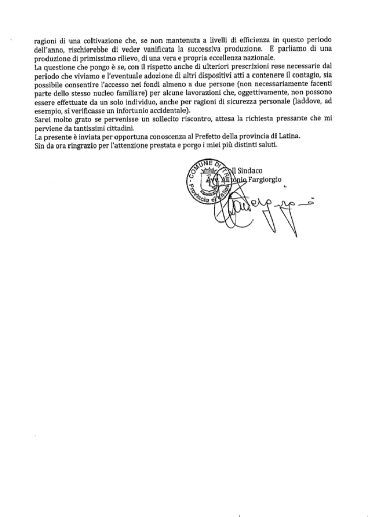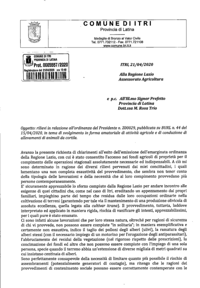 “Mentre a livello nazionale si comincia a parlare di una possibile riapertura, sebbene differenziata da regione a regione, ad Itri ci si adopera per superare la crisi per il sistema agricolo, che è uno dei settori cruciali per l’economia del centro aurunco. Così il Sindaco Fargiorgio scrive all’Assessorato Regionale all’Agricoltura e per conoscenza al Prefetto di Latina, per chiedere chiarimenti sull’Ordinanza Regionale di accesso ai fondi agricoli. Il Sindaco, sollecitato da diversi cittadini, in particolare, chiede chiarimenti sull’accesso ai fondi, in relazione alle diverse tipologie di coltivazioni. Inoltre, scrive l’Avv. Fargiorgio, sebbene sia importante il distanziamento sociale ed il rispetto delle norme sul contenimento della diffusione del Covid19, si chiede una precisazione sull’accesso ai fondi, quando il lavoro sulla coltivazione renda necessaria la presenza di più operatori. La parola passa quindi alla Regione, il cui chiarimento è atteso da molti cittadini itrani”.