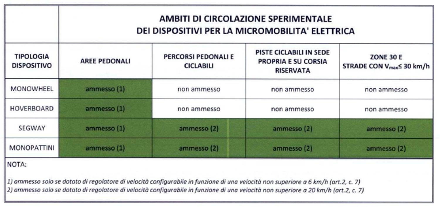 I monowheel e gli hoverboard potranno circolare solo nelle aree pedonali e a velocità inferiori a 6 km/h. La limitazione riguarderà su questi percorsi anche i segway ed i monopattini. Segway e monopattini saranno ammessi anche su percorsi pedonali e ciclabili, piste ciclabili in sede propria e zone 30 e strade con limite di velocità di 30 km/h a velocità non superiore a 20 km/h. Tutti i veicoli dovranno essere dotati di dispositivo di autolimitazione di velocità configurabile per i limiti previsti, e riportare la prevista marcatura CE.