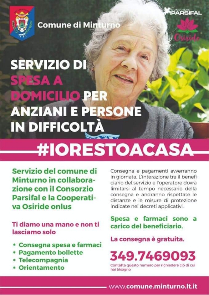 Sulla pagina istituzionale Facebook il sindaco di Minturno Gerardo Stefanelli ha annunciato il servizio di spesa a domicilio che – scrive il primo cittadino – partirà martedì 31 marzo e sarà rivolto ad anziani e persone in difficoltà. Con il servizio attivato dall’amministrazione in collaborazione con il Consorzio Parsifal e la cooperativa Onsiride onlus le persone potranno rivolgersi al numero 349.7469093 per ricevere la consegna a domicilio della spesa e dei farmaci o per effettuare il pagamento delle bollette. Ma anche per avere supporto psicologico e assistenza attraverso tele-compagnia.