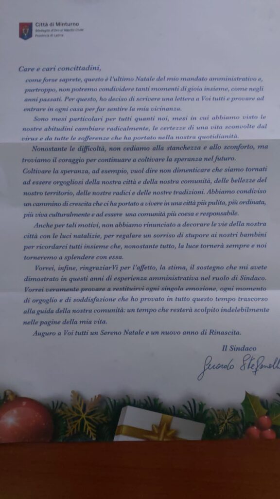 La dirigenza minturnese di Fratelli d’Italia ha fatto pervenire alla stampa una valutazione polemica e negativa sull’operato del primo cittadino in occasione delle festività natalizie che riportiamo testualmente: “La letterina di Natale del Sindaco Gerardo Stefanelli ha fatto letteralmente saltare dalla sedia gli esponenti minturnesi del partito di Giorgia Meloni, nello specifico i dirigenti Moccia e Smith contestano quello che doveva essere un messaggio di auguri per il Santo Natale e per l’anno nuovo, ma che invece a tutti gli effetti è un manifesto di inizio campagna elettorale. Frasi del tipo: “Coltivare la speranza, vuol dire non dimenticare che siamo tornati ad essere orgogliosi della nostra città e della nostra comunità” (come se l’orgoglio di vivere in un posto meraviglioso sia dovuto alla sua amministrazione), oppure “abbiamo condiviso un cammino di crescita che ci ha portato a vivere una città più pulita, più ordinata, più viva culturalmente e ad essere una comunità più coesa e responsabile” (come se prima non fossimo tutti responsabili e coesi), ed anche “non abbiamo rinunciato a decorare le vie della nostra città con le luci natalizie, per regalare un sorriso di stupore ai nostri bambini” (quasi come fosse una gentile concessione di un Babbo Natale con la fascia tricolore). Rappresentano senza ombra di dubbio uno spot elettorale delle poche cose fatte pertanto riassumibili facilmente in una letterina”.