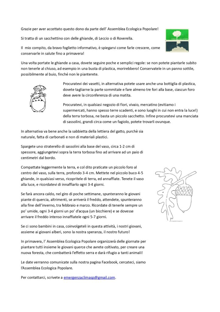 A questo scopo, contestualmente, sarà distribuito anche un volantino con le indicazioni necessarie a prendersi cura e, quindi, veder crescere le ghiande, per poi condividere con l’Assemblea ecologica popolare del Golfo l’esperienza di piantarle nella prossima stagione primaverile.