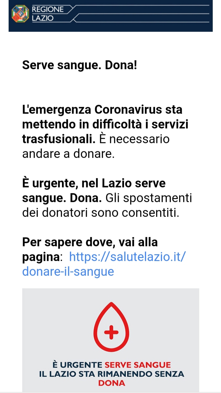L’emergenza Coronavirus sta mettendo in difficoltà i servizi trasfusionali. È necessario andare a donare. È urgente, nel Lazio serve sangue. Dona. Gli spostamenti dei donatori sono consentiti. Per sapere dove, vai alla pagina: https://salutelazio.it/donare-il-sangue