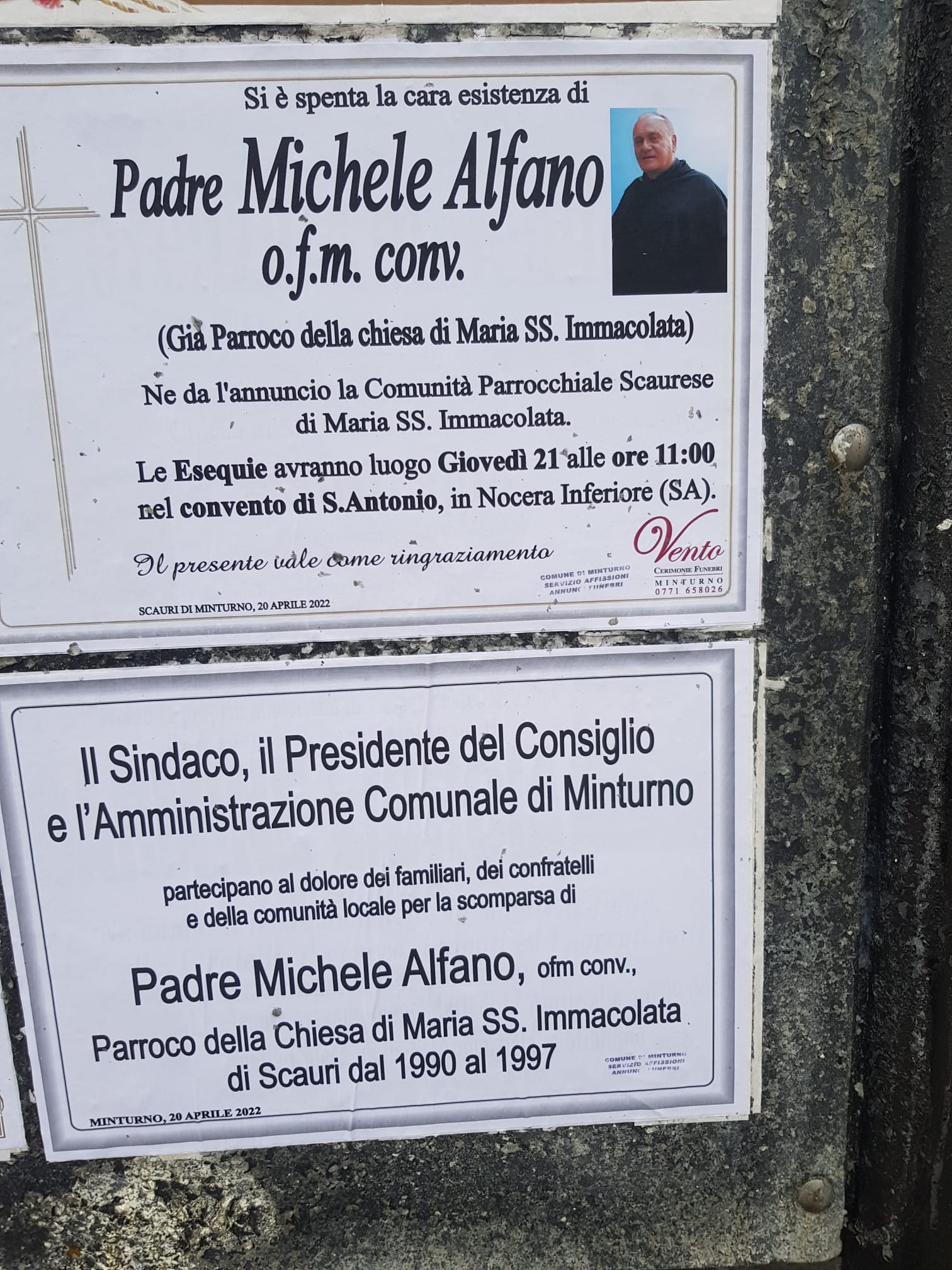 Lutto nella comunità francescana, dolore tra i fedeli. È scomparso, dopo una lunga malattia, padre Michele Alfano, figura carismatica legata attualmente al Convento di Sant’Antonio e parroco del Corpo di Cristo in piazza Zanardelli a Nocera Inferiore. Aveva 74 anni, essendo nato il 31 marzo 1948. Era stato ordinato sacerdote nel 1974, originario di Angri. Il lutto ha colpito tutte le comunità che lo hanno visto come pastore. Dal 1990 al 1997 è stato parroco della Chiesa di Maria Santissima Immacolata in Scauri. Profondamente amato per la sua dolcezza sacerdotale, il suo rispetto del prossimo, la sua carità e per l’attenzione posta nel migliorare la struttura del tempio. Chi scrive aveva con lui un bellissimo rapporto, gemelli astrali, all’ordinazione diaconale il 25 maggio 1991 era stato nominato da lui terziario francescano. Il Comune di Minturno e la Comunità Parrocchiale lo hanno ricordato con dei manifesti a lutto. Una delegazione di scauresi ha partecipato alla funzione funebre. A Scauri si terrà una santa messa in occasione del trigesimo. La camera ardente è stata allestita nella Chiesa del convento di Sant’Antonio sino ad oggi. Alle 11 vi è stato il rito funebre.