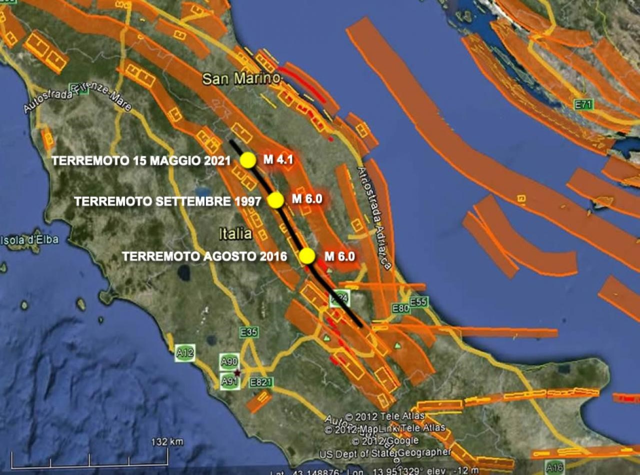 La linea immaginaria (in nero) che unisce gli epicentri ricalca quasi alla perfezione l’andamento di una zona di faglia molto importante.