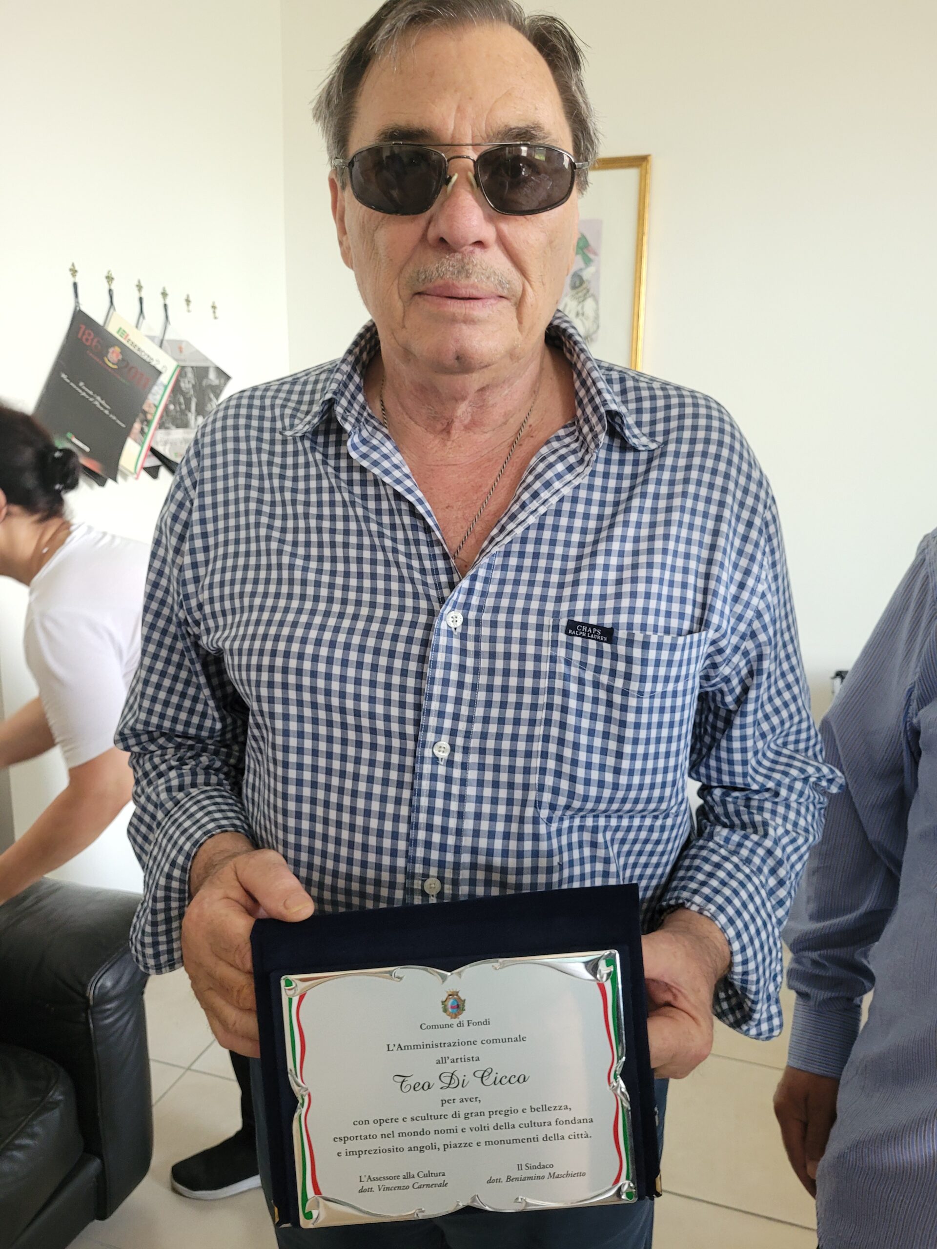 “All’artista Teo Di Cicco – recita il riconoscimento – per aver, con opere e sculture di gran pregio e bellezza, esportato nel mondo nomi e volti della cultura fondana e impreziosito angoli, piazze e monumenti della città”.