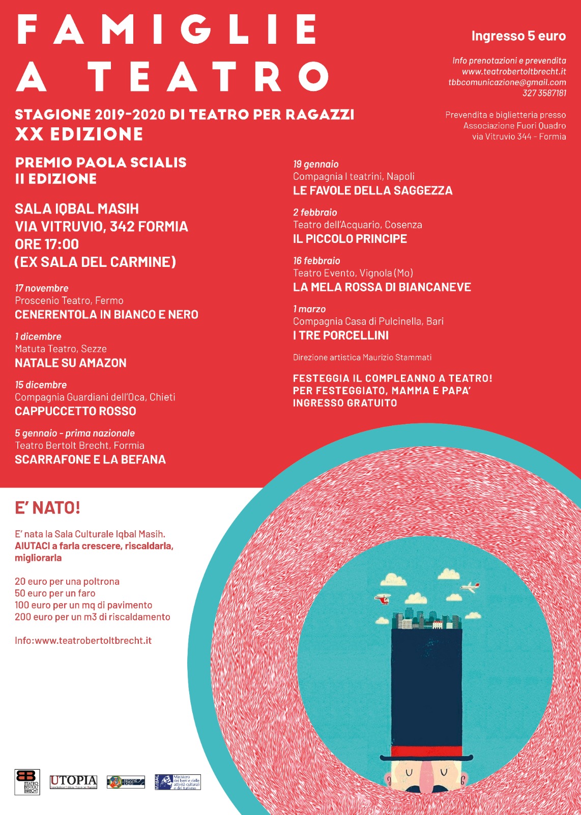 Il 17 novembre alle ore 17:00 torna “Famiglie a teatro” la stagione di teatro per ragazzi di Formia promossa dal Teatro Bertolt Brecht all’interno del progetto “Officine culturali” della Regione Lazio e del riconoscimento del Mibact. Giunta alla sua XX edizione, da due decenni la stagione porta bambini, ragazzi, famiglie a teatro. L’edizione 2019 si sposta nella nuova Sala Iqbal Masih (via Vitruvio, 342 – ex Sala del Carmine) che per la prima volta apre le sue porte al pubblico. Per l’occasione alle ore 16:30 si terrà la cerimonia di intitolazione al bambino pakistano simbolo della lotta per i diritti dell’infanzia.