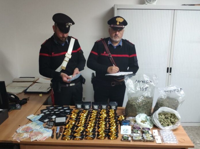 Nel corso di una perquisizione domiciliare, il giovane è stato trovato in possesso di kg 2,5 di marijuana, kg 1,5 di hashish, bilancini e materiale per il confezionamento, il tutto sottoposto a sequestro.