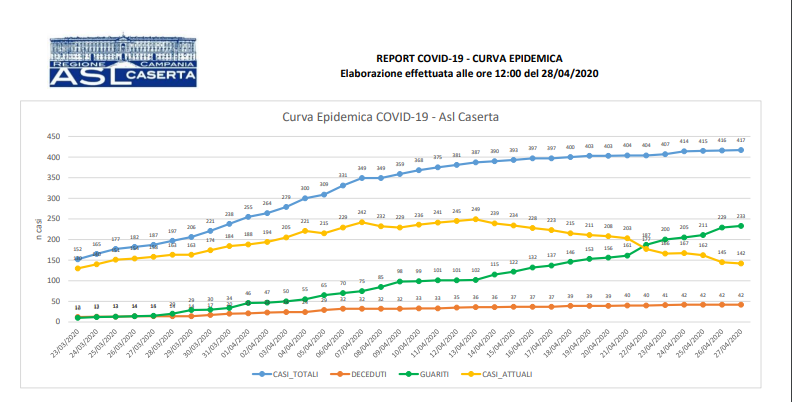 Il dato che proviene dal bollettino diramato dalla Regione Campania alle ore 22 emerge che su 73.094 tamponi eseguiti dall’inizio dell’emergenza sono risultati positive 4.410 persone, con un incremento di 30 casi rispetto alla giornata di ieri. Nella Provincia di Caserta i casi registrati dall’inizio dell’emergenza sono 417, con un solo positivo in più rispetto alla giornata di ieri, nella quale sono state dichiarate guarite tre persone a fronte di nessun decesso.