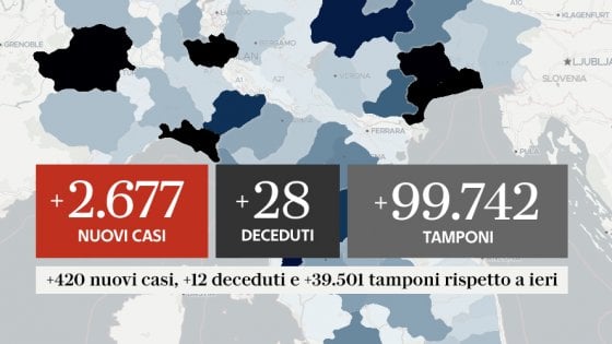 A fronte dei 99.742 tamponi fatti (quasi 40mila più di ieri), i nuovi casi di contagio di coronavirus oggi sono 2.677.