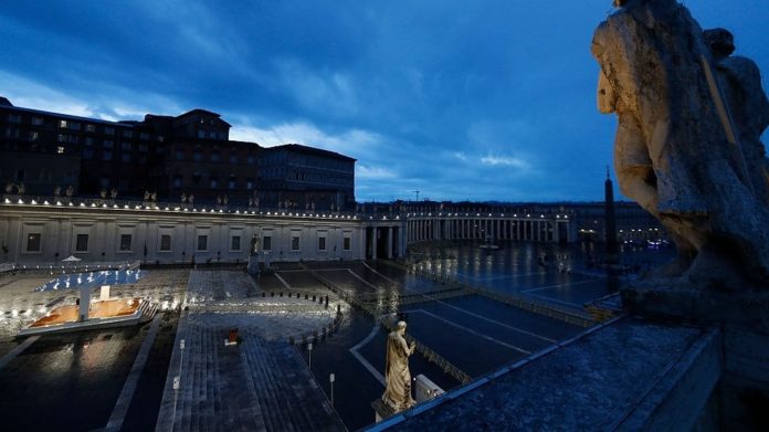 Un silenzio surreale apre la diretta su TV 2000 e Rai Uno alle ore 18.00 da Piazza San Pietro in Roma, totalmente vuota. Il sole tramonta e il sagrato è bagnato da una pioggerellina sottile, nessun commento televisivo, sembrano udirsi i passi del Santo Padre mentre sale la scala che lo porta nello spazio adibito alla sua funzione. Un solo presbitero lo accoglie mentre una suora (TV 2000) e una laica (Rai Uno) in un riquadro traducono le parole per i non udenti. Un laico canta il santo evangelo. Prima dell’apertura del Santo Padre la regia offre ai telespettatori l’immagine sublime del Crocifisso della Chiesa di San Marcello e lo farà più volte durante la trasmissione, con primi piani di profilo del volto veramente sublimi. “Da settimane sembra che sia scesa la sera. Fitte tenebre si sono addensate sulle nostre piazze, strade e città; si sono impadronite delle nostre vite riempiendo tutto di un silenzio assordante e di un vuoto desolante, che paralizza ogni cosa al suo passaggio: si sente nell’aria, si avverte nei gesti, lo dicono gli sguardi. Ci siamo ritrovati impauriti e smarriti. Come i discepoli del Vangelo siamo stati presi alla sprovvista da una tempesta inaspettata e furiosa. Ci siamo resi conto di trovarci sulla stessa barca, tutti fragili e disorientati, ma nello stesso tempo importanti e necessari, tutti chiamati a remare insieme, tutti bisognosi di confortarci a vicenda.