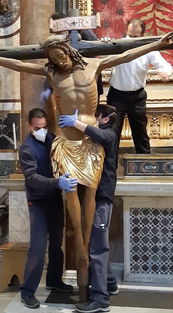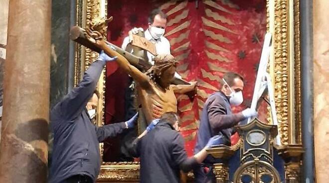 Il crocefisso è normalmente custodito nella Chiesa di San Marcello al Corso a Roma, visitato domenica 15 marzo da Papa Francesco in pellegrinaggio. Il crocefisso è stato portato in Vaticano in preparazione al momento di preghiera voluto dal Santo Padre per oggi. Papa Francesco dopo aver presieduto in diretta televisiva la funzione dal sagrato della basilica petrina davanti alla piazza vuota, si è raccolto in preghiera e meditazione dinanzi al Santissimo e, quindi, ha impartito al termine la benedizione Urbi et Orbi con la possibilità di ricevere l’indulgenza plenaria, per chiedere la fine della pandemia di coronavirus Covid-19. Il Crocifisso esposto è ritenuto miracoloso. Nel 1519 un incendio, nella notte, distrugge completamente la precedente Chiesa in Via del Corso, intitolata a San Marcello. Il mattino seguente spentesi le fiamme si registra che l’intero edificio è ridotto in macerie, ma fra le rovine emerge integro il crocifisso dell’altare maggiore, ai piedi del quale arde ancora una piccola lampada ad olio. Tre anni dopo l’incendio, Roma viene colpita da quella che fu definita “la Grande Peste”. Il popolo porta il crocifisso in processione, riuscendo a vincere anche i divieti delle autorità, comprensibilmente preoccupate per il diffondersi del contagio. Il crocifisso viene prelevato e portato per le vie di Roma verso la Basilica di San Pietro. La processione dura sedici giorni: dal 4 al 20 agosto 1522. Man mano che si procede, la peste dà segni di regressione, e dunque ogni quartiere cerca di trattenere il crocifisso il più a lungo possibile. Al termine, al momento del rientro in chiesa, la peste è del tutto cessata. La foto apparsa ovunque di Papa Francesco che si reca a piedi nella Chiesa di via del Corso per pregare ai piedi del Crocefisso commuove i cattolici. È un pellegrinaggio solitario che scuote gli animi dell’intero mondo cattolico. Il Santo Padre stasera ha concesso l’indulgenza plenaria a tutto il mondo e, si legge in una nota precedente all’evento della sala stampa della Santa Sede, che in questo tempo di emergenza per l’umanità, invita i cattolici a unirsi spiritualmente in preghiera con lui. Abbiamo cantato a squarciagola dai balconi, ci siamo sbracciati alle finestre, i più temerari sono saliti fin sopra i terrazzi… abbiamo organizzato flash mob, sventolato tricolori, sbatacchiato i coperchi delle pentole, suonato chitarre, batterie, violini, pifferi e perfino cornamuse. Adesso dopo queste esibizioni prettamente laiche ci siamo uniti alla preghiera del Papa.