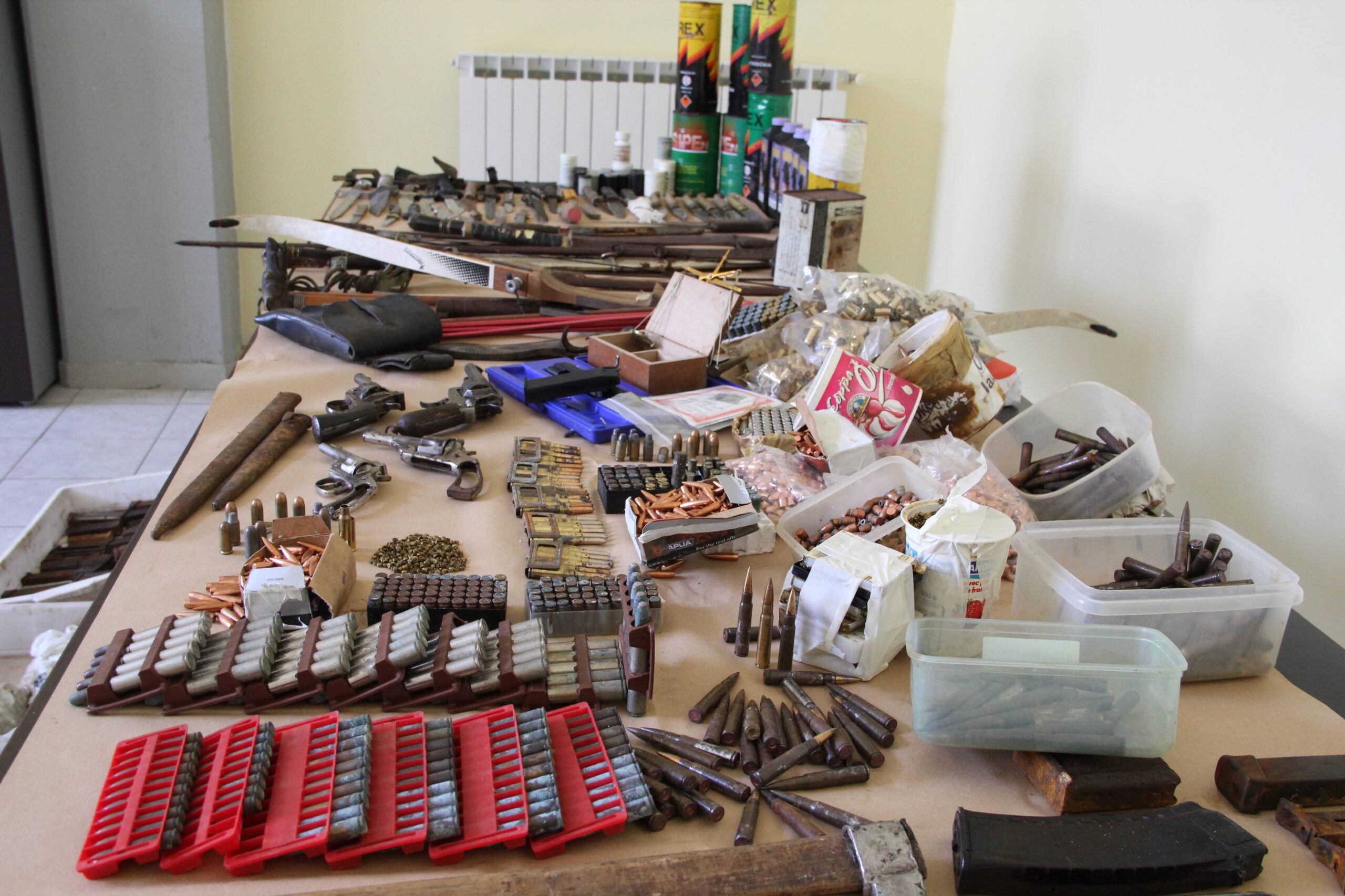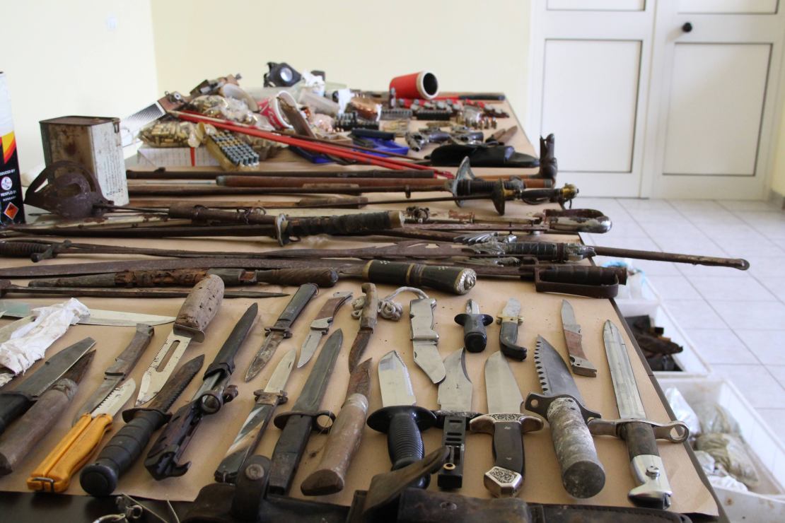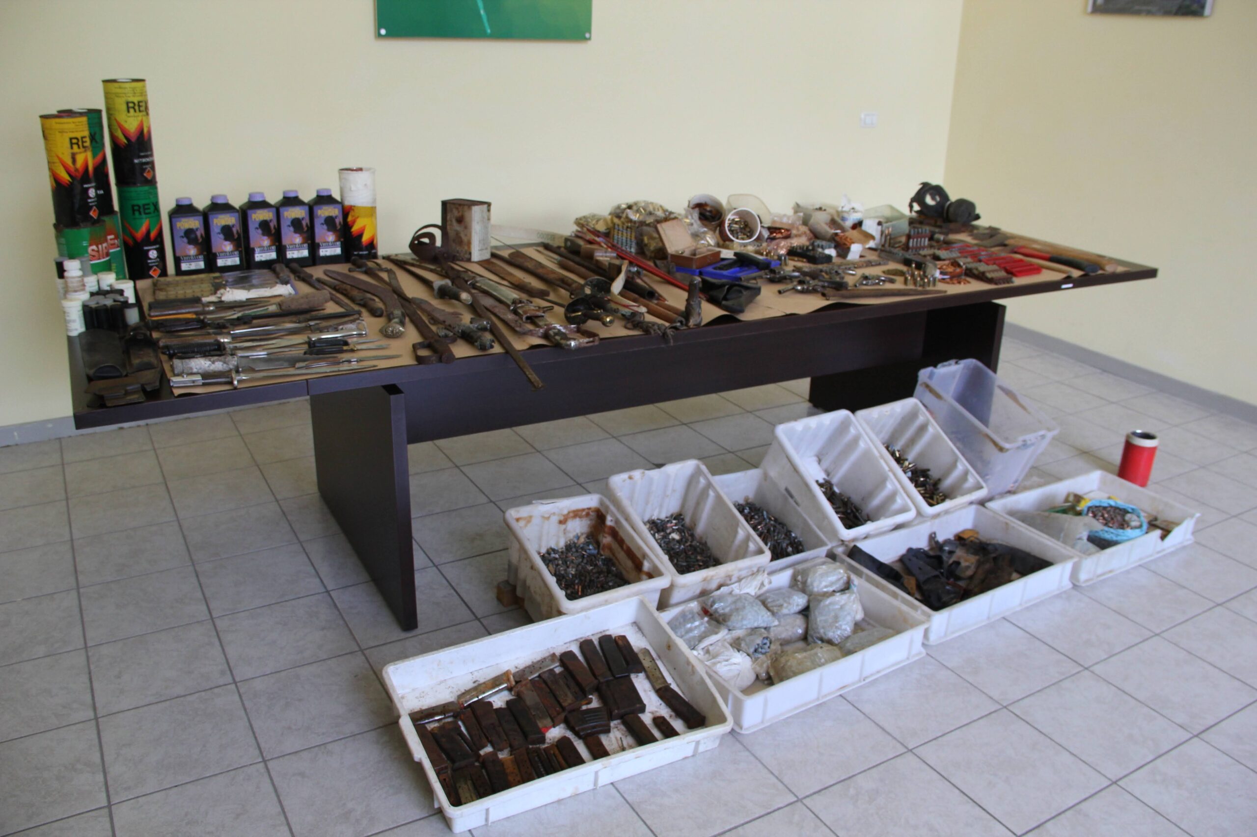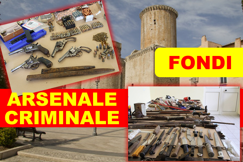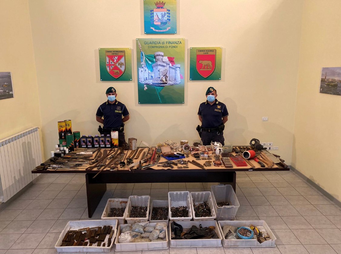 Le Fiamme Gialle di Fondi, supportati dai “Baschi Verdi” di Formia hanno rastrellato e ispezionato un’area di circa 30 mila metri quadri, apparentemente abbandonata, rinvenendo 4 pistole a tamburo e altre parti di armi comuni da sparo, quali caricatori, canne calibro 22 e una canna di fucile. E’ stato altresì ritrovato un cannone obice da guerra calibro 109 mm di produzione americana risalente probabilmente al secondo conflitto mondiale. Numerose anche le armi da taglio rinvenute: circa 50 tra baionette, pugnali, coltelli e mannaie di varie misure. Alcune di queste sono di presumibile interesse storico, altre invece contemporanee come dimostrato anche dal perfetto stato di manutenzione. Ritrovato altresì, munizionamento di diverso calibro e tipo (anche da guerra), quantificato in oltre 1.000 cartucce, 175 mila ogive, 320 mila bossoli, 16 mila inneschi e oltre 15 chilogrammi di polvere da sparo. Rinvenuto anche un bilancino di precisione per polvere da sparo, dedicato, con ogni probabilità alla preparazione delle cartucce. Il tutto era ben occultato nelle intercapedini realizzate all’interno dei ruderi presenti nell’area, o disseminato ed occultato dalla fitta boscaglia che circondava i fabbricati.