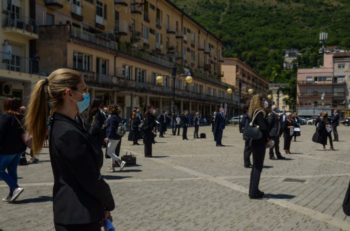 Un centinaio gli avvocati hanno protestato in un silenzioso flashmob, contro il Governo che non permette la ripresa dell’attività ordinaria; venerdì mattina 29 maggio alle ore 12 in piazza Labriola a Cassino, di fronte al Tribunale. Il gesto di protesta era indirizzato al Governo, contro i processi rinviati e gli adempimenti rallentati per l’emergenza Covid-19 e per richiedere il ripristino delle attività. Gli avvocati si sono disposti occupando gran parte della piazza con addosso la toga e in mano un codice: simboli della loro professione. Uno per volta si sono diretti verso la scalinata del Palazzo di Giustizia dove hanno posato, in segno di protesta, il Codice Penale o Civile che avevano in mano. Una volta terminata la sfilata e riempiti i primi due scalini di codici, hanno levato la toga e alzato un foglio con su scritto “Tutti noi avvocati d’Italia riconsegniamo i nostri codici davanti ai Tribunali. Il nostro grido di dolore per la giustizia sospesa”.