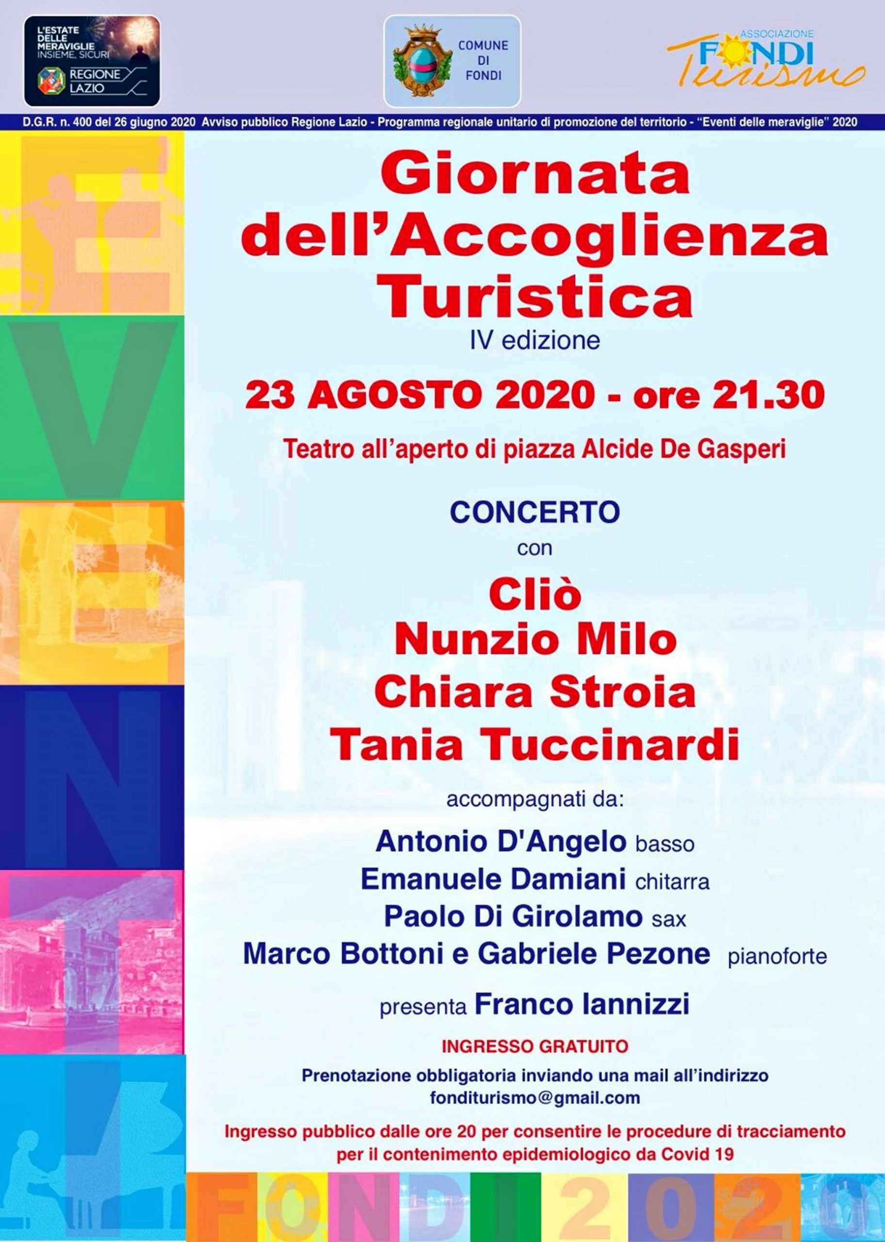 Il Vice Sindaco Beniamino Maschietto rende noto che il concerto, a ingresso libero, è incluso nella IV edizione della “Giornata dell’Accoglienza Turistica” – promossa dal Comune di Fondi in collaborazione con l’Associazione Fondi Turismo e organizzata con il sostegno della Regione Lazio nell’ambito del Programma regionale unitario di promozione del territorio “Eventi delle meraviglie 2020” – e vedrà esibirsi i cantanti Cliò, Nunzio Milo, Chiara Stroia e Tania Tuccinardi accompagnati da Antonio D’Angelo (basso), Emanuele Damiani (chitarra), Paolo Di Girolamo (sax), Marco Bottoni e Gabriele Pezone (pianoforte). La serata sarà presentata da Franco Iannizzi.