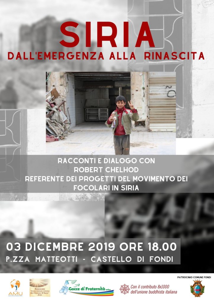 Ed è proprio per dar voce ai bisogni degli ultimi e dei più poveri che martedì 3 dicembre 2019 alle ore 18.00, presso il Castello di Fondi (Piazza Matteotti), si terrà il convegno dal titolo “Siria, dall’emergenza alla rinascita”, momento di ascolto e conoscenza della situazione in Siria.