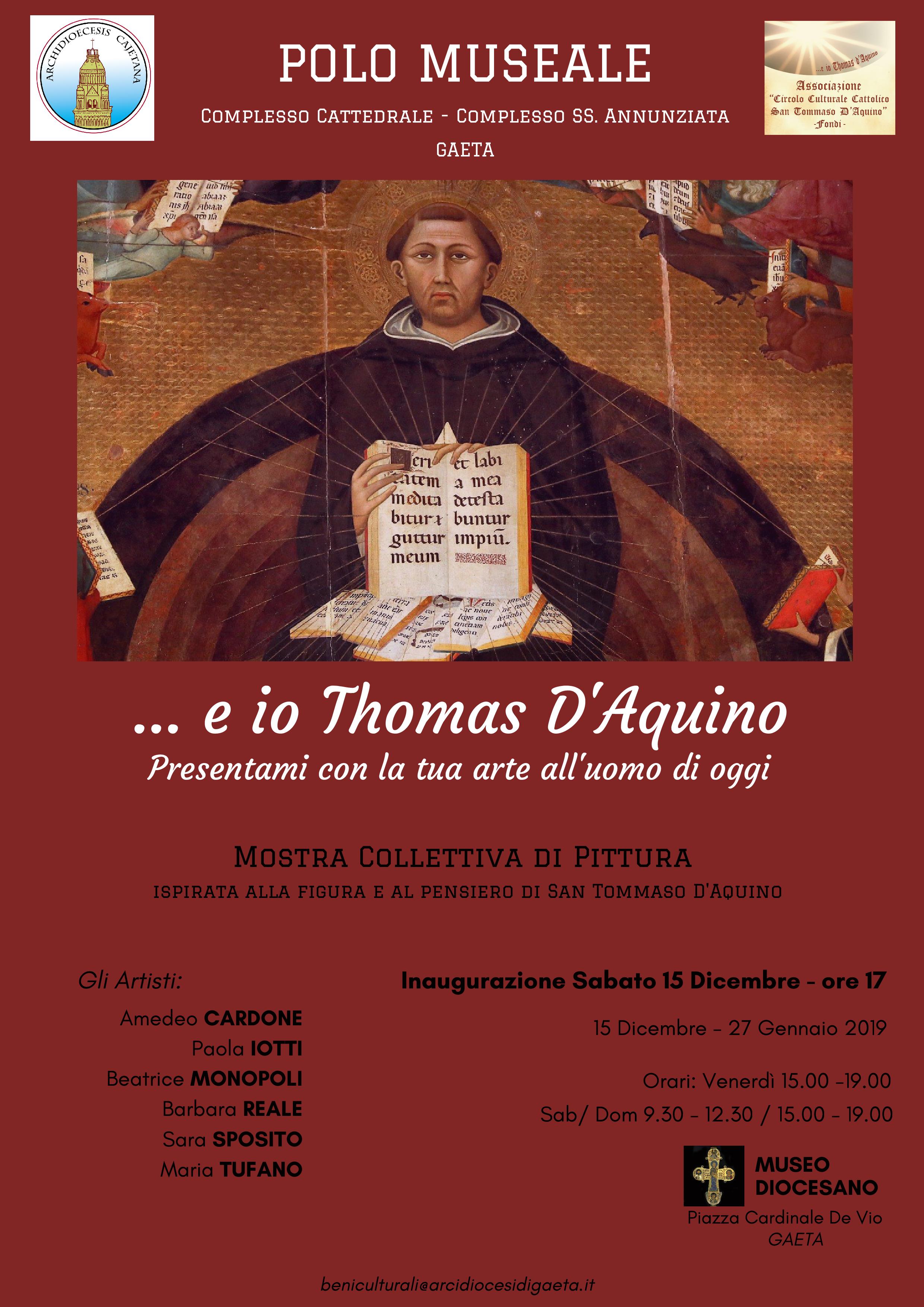 L’organizzazione della mostra, le cui opere sono state esposte nei mesi scorsi nella caratteristica cornice di Palazzo Caetani in Fondi, nasce dall’intento dell’Associazione di diffondere per mezzo dell’arte la conoscenza della grande figura di san Tommaso D’Aquino, il Doctor Angelicus.